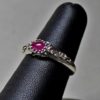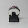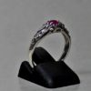 The ring has the classic narrow raised center that is capped by an oval cabochon pink sapphire. The stone is approximately 6mmx4mm, it is a size 6. The sapphire is a beautiful deep pink . The ring has delicate raised scrolling around the stone’s setting and partway down its sides.