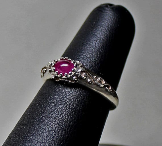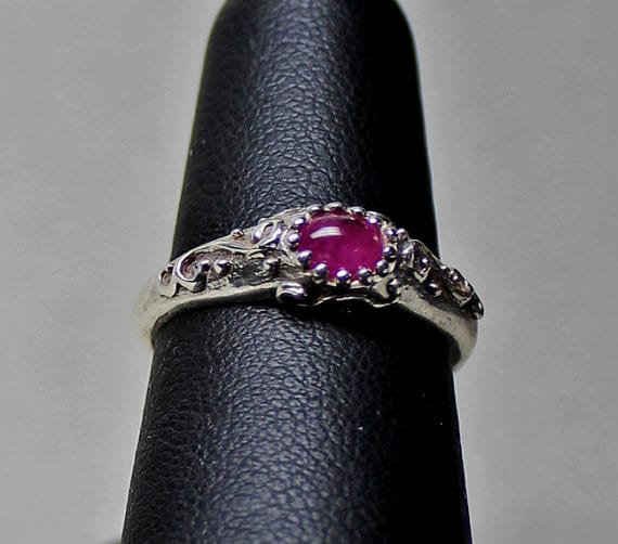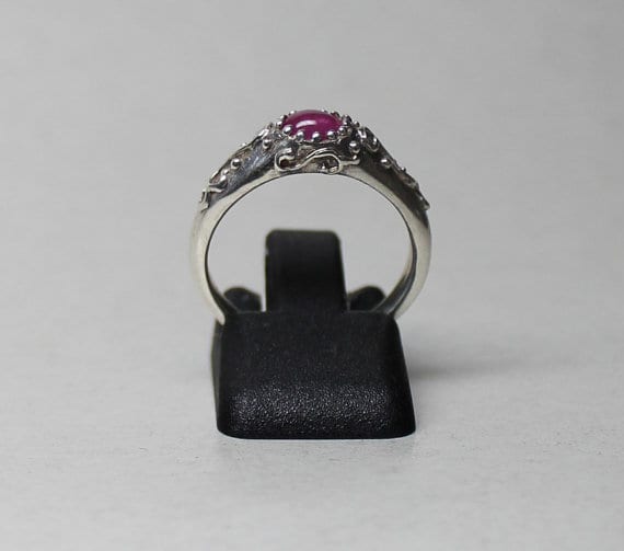 The ring has the classic narrow raised center that is capped by an oval cabochon pink sapphire. The stone is approximately 6mmx4mm, it is a size 6. The sapphire is a beautiful deep pink . The ring has delicate raised scrolling around the stone’s setting and partway down its sides.