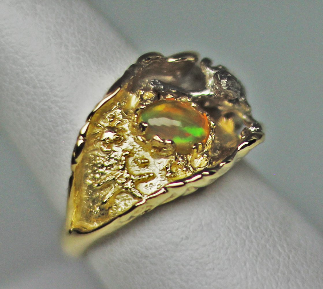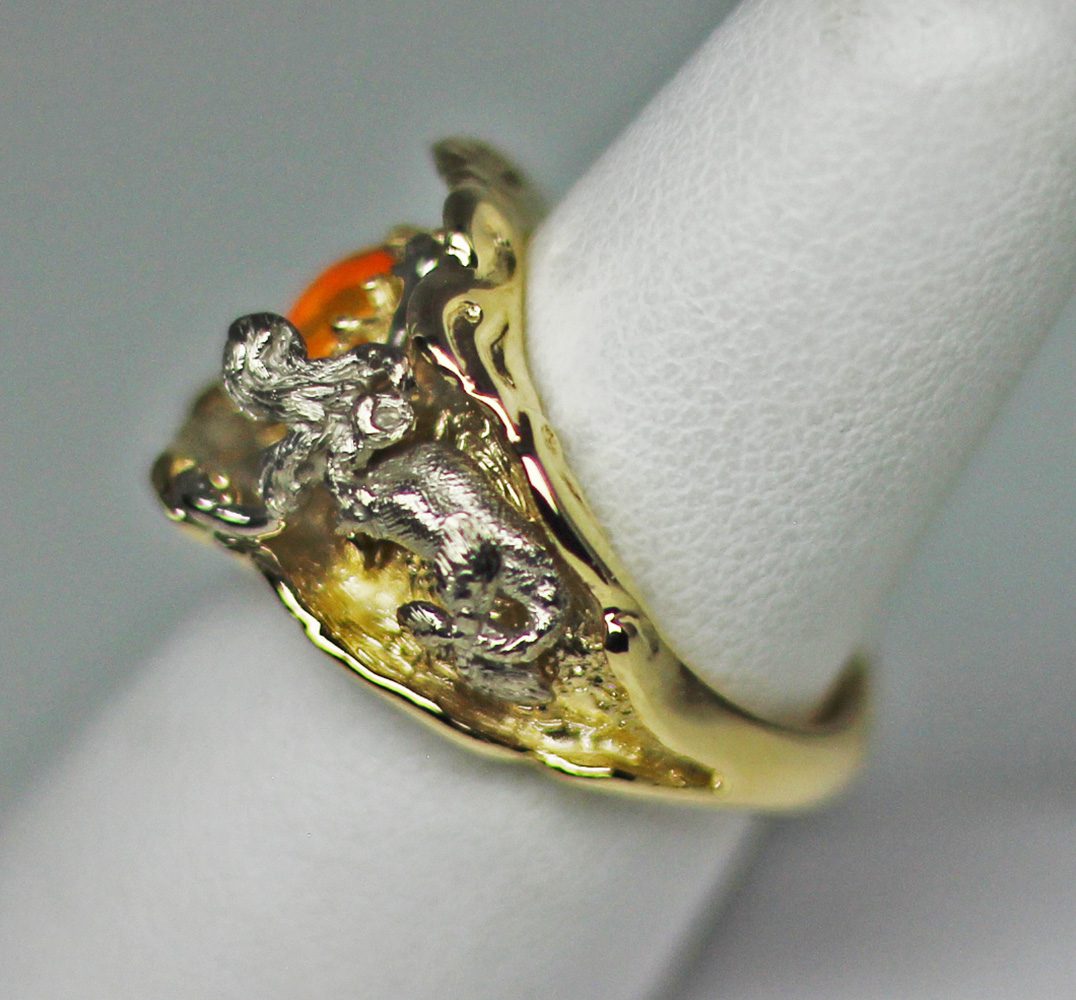 Mermaids Grotto Opal ring,I guess that it's Mermaid season? Here is an updated version of an original Mermaid ring that I designed in 1974?. The grotto is home to a few creatures that I will allow you to discover for yourself. Originally the ring was cast in just one color of gold and the sides of the ring were smooth. I've set a very unusual gold Ethiopian opal emerging from a bed of coral, in this ring that just explodes with color. No wonder it has the Mermaid captivated. If you like whimsical designs you might like some of the designs here: https://postgatejewelers.com/product-category/flowers-vines-and-animal-jewelry/