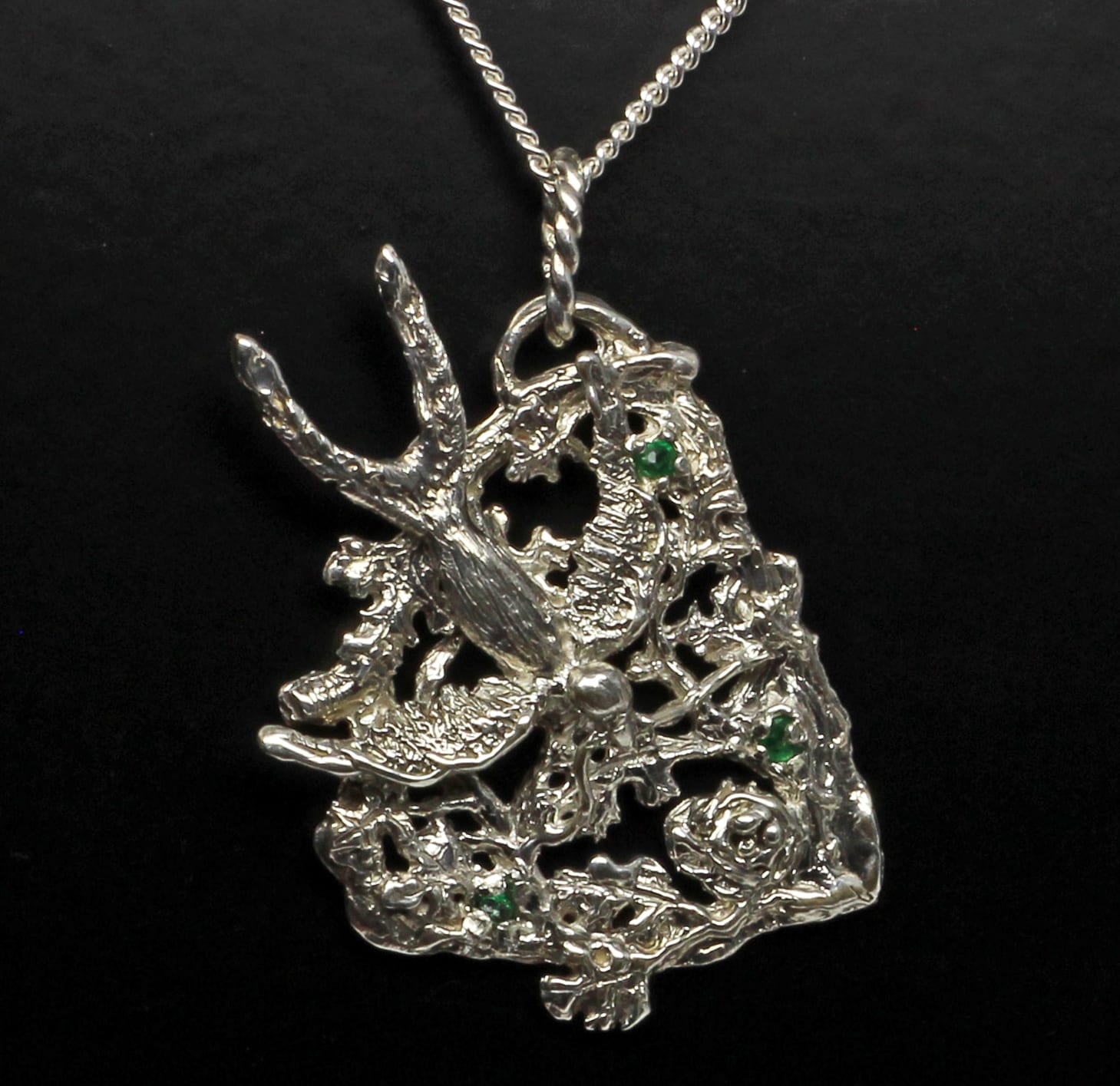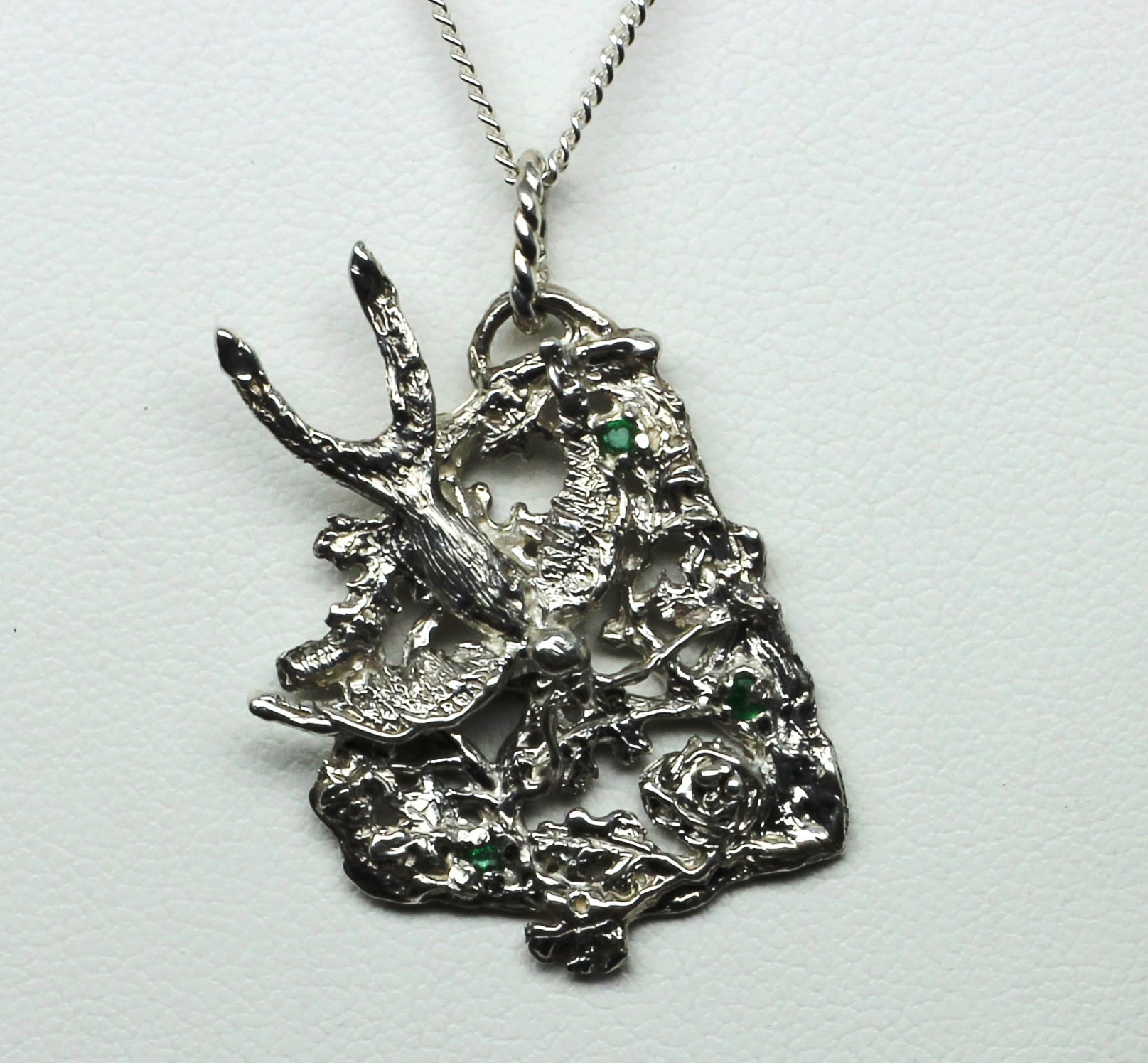 Nesting swallow pendant in sterling silver, it shows a swallow flying to her nest to add some twigs. There are eggs in the nest which rests in a leafy branch of a tree that is covered with leaves and flowers. There are three small natural emeralds in the tree to give the piece some color and preciousness. If you like this pendant, here is a link to some others that might please you: https://postgatejewelers.com/product-category/flowers-vines-and-animal-jewelry/