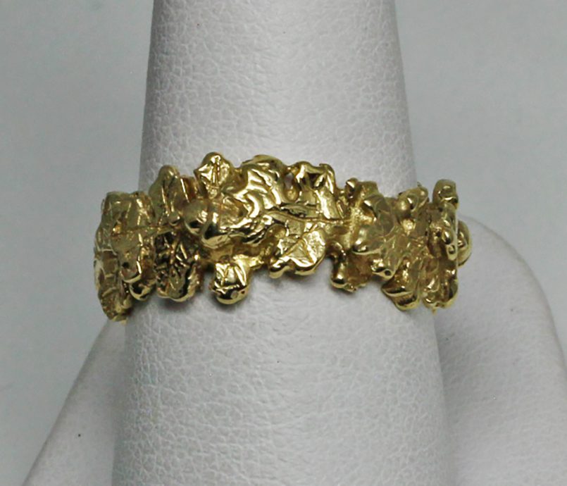 This band is made in 14K gold. The ring is first carved in wax She can alter the wax as needed to make it almost any size. She fills in the design when She makes a larger size and takes some out to reduce its size. This can be pretty challenging since the design must have the same flow and beauty as the original. Its sides are nicely rounded for comfort, and the detailing has been designed to wear well. It will continue to delight for many many years. You can order in 14K in rose, and white palladium golds as well as 18K yellow gold. This band is carved in 14k yellow gold. Other sizes are also available and if you want a heavier wider version I’ll make one. The price will vary. There is also a version that is set with a stone. We have a wide selection of our work on FaceBook. Some pieces are shown in various stages of completion. When we do a special piece for a customer we often send them image of waxes. This makes it easier for them to understand what we are doing. It also allows us to work together and insure the creation of something special: https://www.facebook.com/Postgate-Fine-Jewelers-111540785537658/photos/?view_public_for=111540785537658&ref=page_internal You may order the Oakleaf and acorn band in almost any size. It is available in 14, 18, 22K and in rose, white and yellow gold. We have a page that explains more about custom orders. It also has a selection of some of our favorite custom pieces: https://postgatejewelers.com/special-order-jewelry/ Custom orders of the ring will ship in three weeks to a couple of months depending on our schedule.Oakleaf and acorn band, Details: