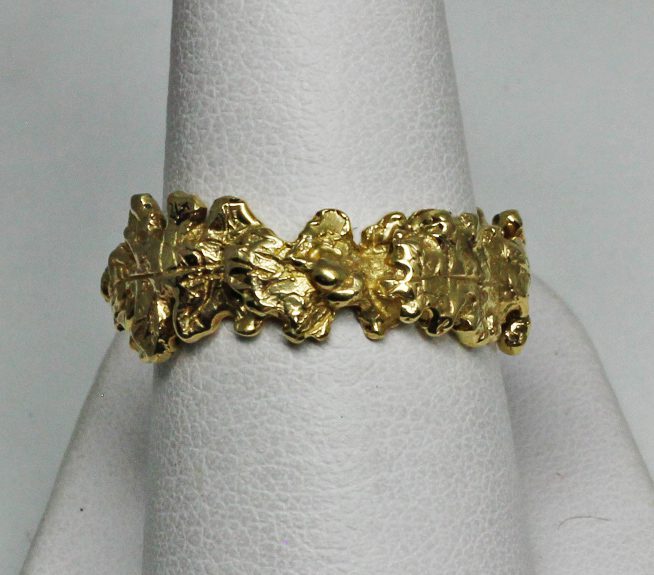 Oakleaf and acorn band, An original design by Suzan Postgate who also made it by hand. This band is very dimensional and solid. She has been making floral and other plant designs for many years. The band's leave's edges are slightly raised so that their details are protected and the band will wear well. she has done her best to create a design that has the randomness of nature. She's captured just a bit of nature's uncanny way of making this randomness beautiful and pleasing. If jewelry inspired by nature is your thing, click here to see more: https://postgatejewelers.com/product-category/flowers-vines-and-animal-jewelry/