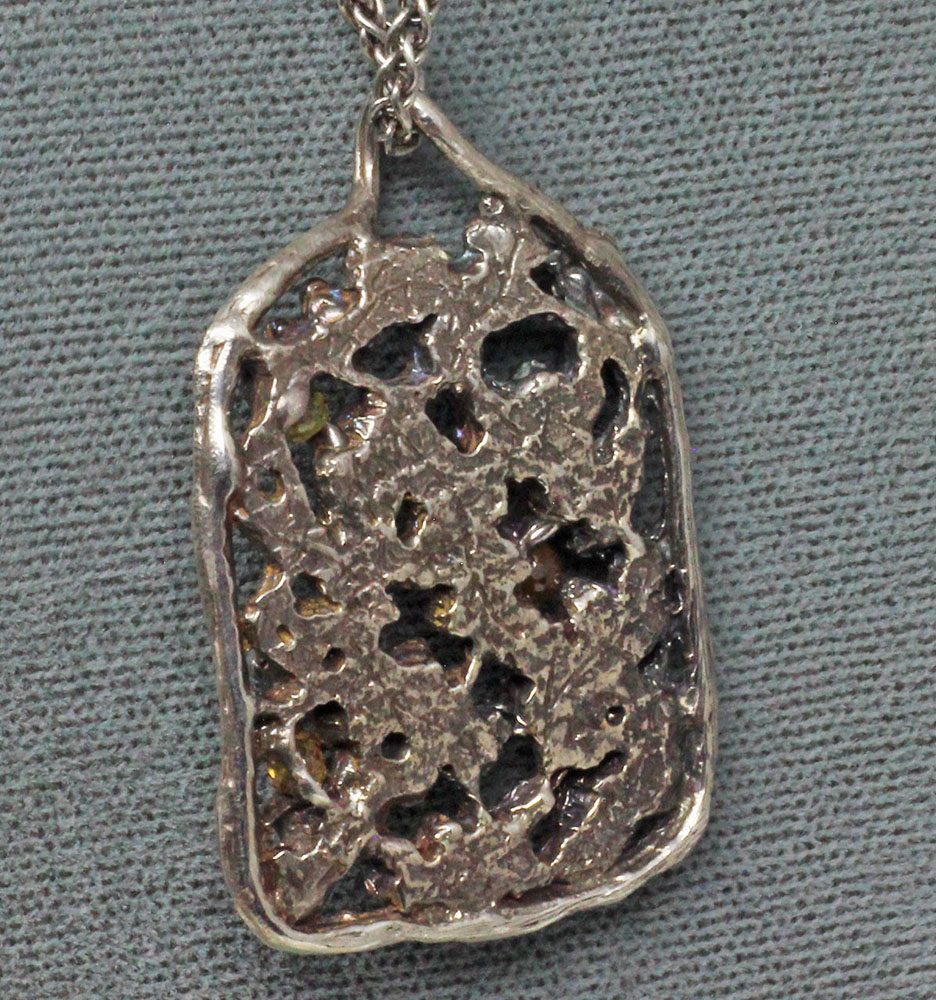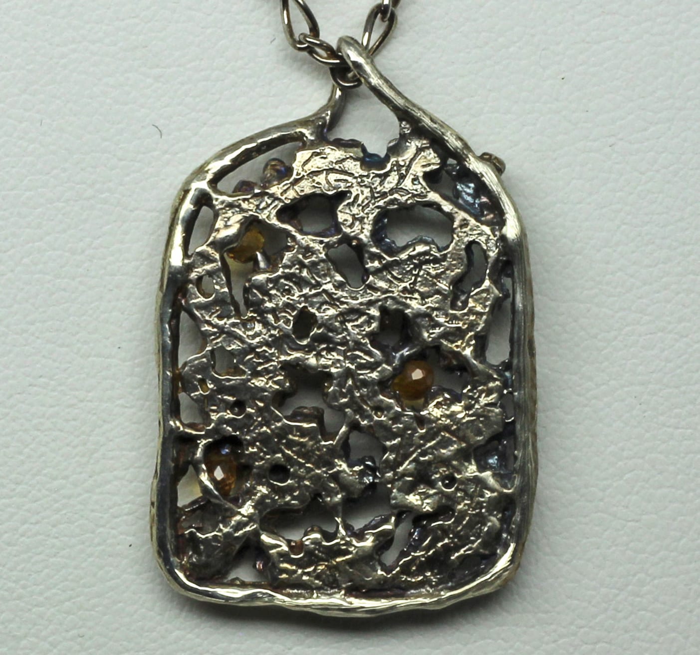 The pendant is lightly oxidized to bring out its details. It has amazing depth without being too thick. Its measurements are 1 ½” tall X 1” wide. A 20” open link sterling silver chain is included with the pendant. The chain is one of our favorites because it is highly versatile. Its open links allow the wearer to shorten the chain by attaching the clasp to any of the larger links, thus the chain can go from a choker to its full 20” length or any length in between.