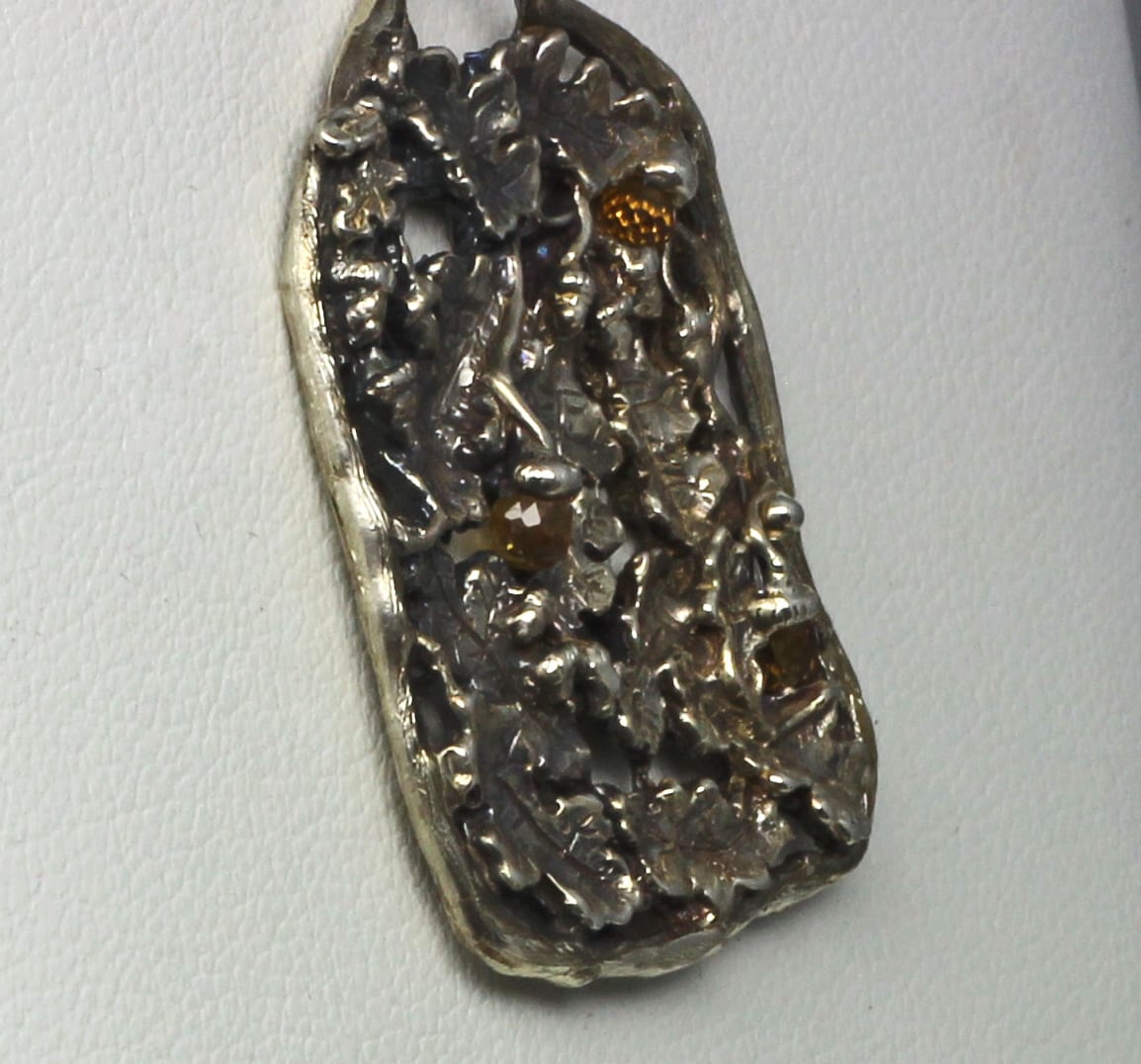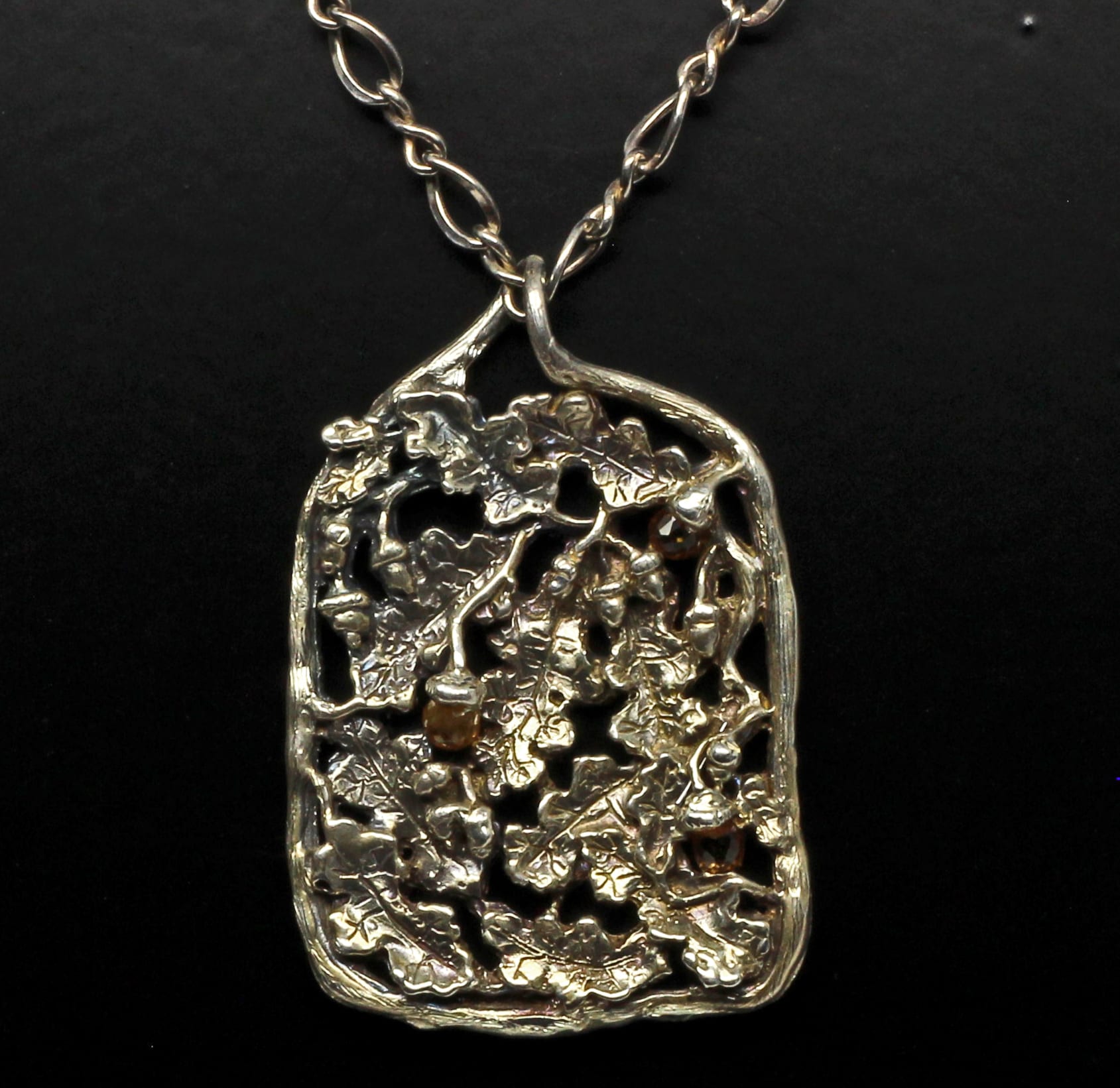 The oak leaf and amber sapphire acorn pendant can be ordered in gold as a special order. Diamonds or other stones can also be added to make the pendant more personal. Price will vary of course.