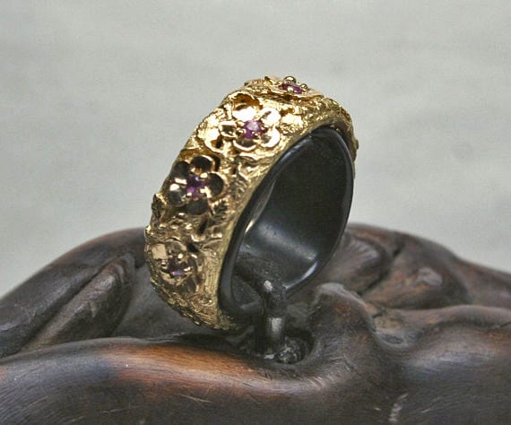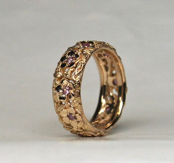 I’ve carved an intricate lace of vines and leaves with meandering flowers growing along its middle. The petals of the flowers are fairly smooth, in their centers are small faceted pink sapphires. The insides of the band’s edges are reinforced to give the band good strength. The band was hand carved in wax, and then in the 18K gold after it was cast. The flowers are been set with 9 small natural pink, brilliant cut sapphires that have a combined weight of 0.27cts