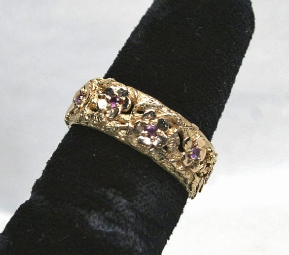 You may order the pink sapphire flower band in almost any size. It is available in 14, 18, 22K and in rose, white and yellow gold. We can also set just about any type of gemstones in it that you might want. We have a page that explains more about custom orders. It also has a selection of some of our favorite custom pieces: https://postgatejewelers.com/special-order-jewelry/