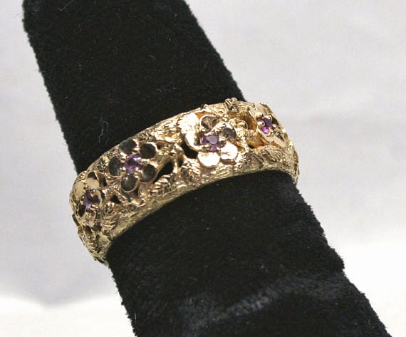 Pink Sapphire Flower Band in 18K, One of my latest floral themed bands. I started making sculptural flower bands and other plant inspired designs, in the 60’s. I’ve been working to perfect them ever since. I’m always trying to show the joy I get from nature’s works, permanent in my jewelry some way. Creating a floral piece that will stand up to normal wear, and still be delicate looking is a challenge. Making the design flow and resonate with the beauty of nature is a great, and perhaps impossible challenge. My hope is that our designs hold your attention, and invite you to explore their mysteries. This is a flower band that I hope will bring its owner a lifetime of pleasure. Worn with reasonable care this band will become a family heirloom. If you would like to see more of our bands click here: https://postgatejewelers.com/shop/bands-wedding-rings/