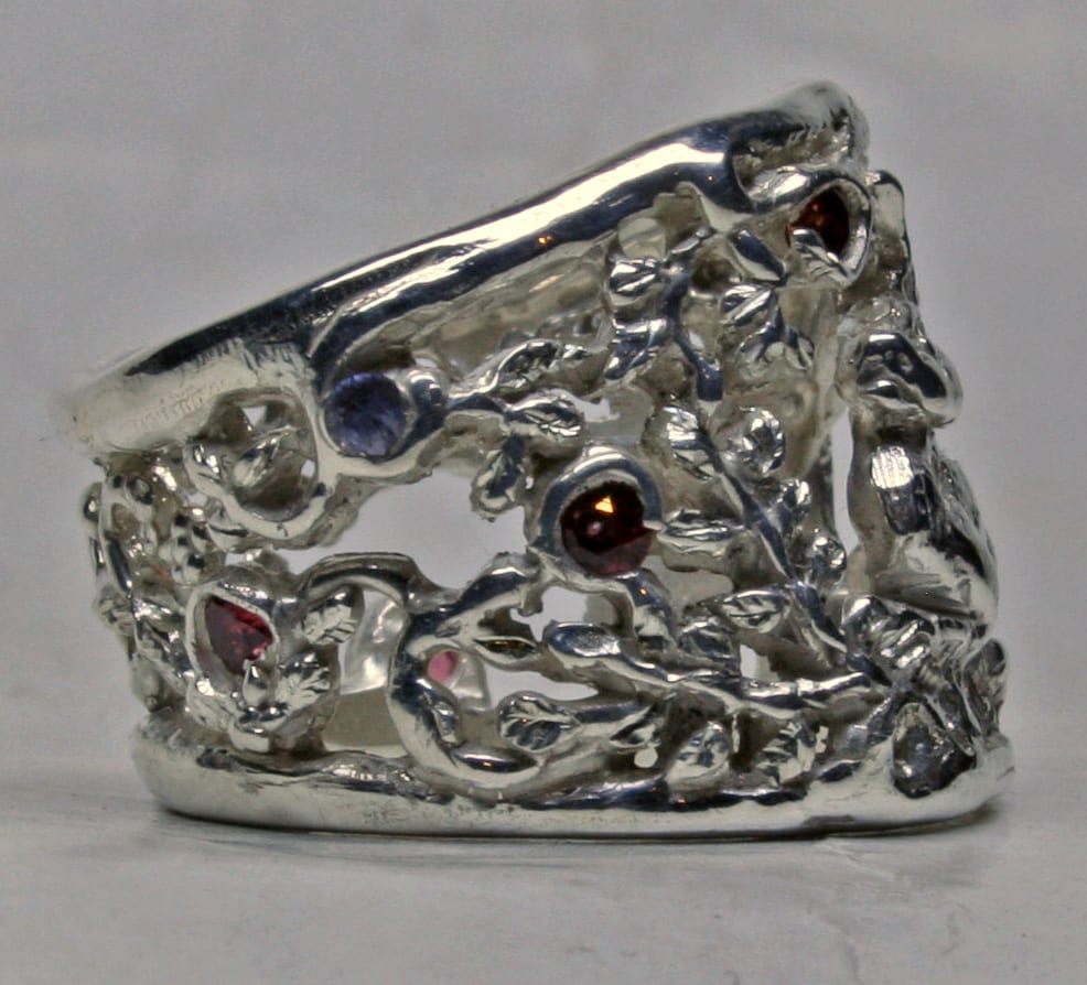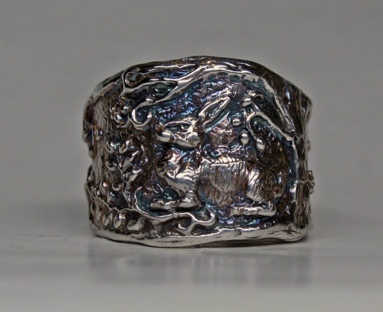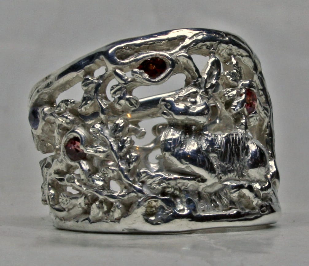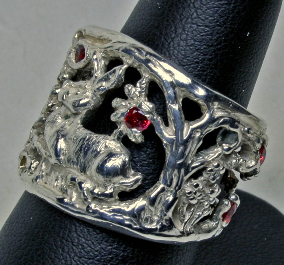 Suzan will make it in other sizes and also with other sapphire colors. Other stones are also available just let us know what stones you would like set in your ring. The rabbit in the forest ring can be ordered in an oxidized finish. Suzan will oxidize the ring in a finish that is darker than a naturaly oxidizad version. This finish will often display color in the oxidation like reds, golds and mixtures of colors. You may also order the ring in gold.