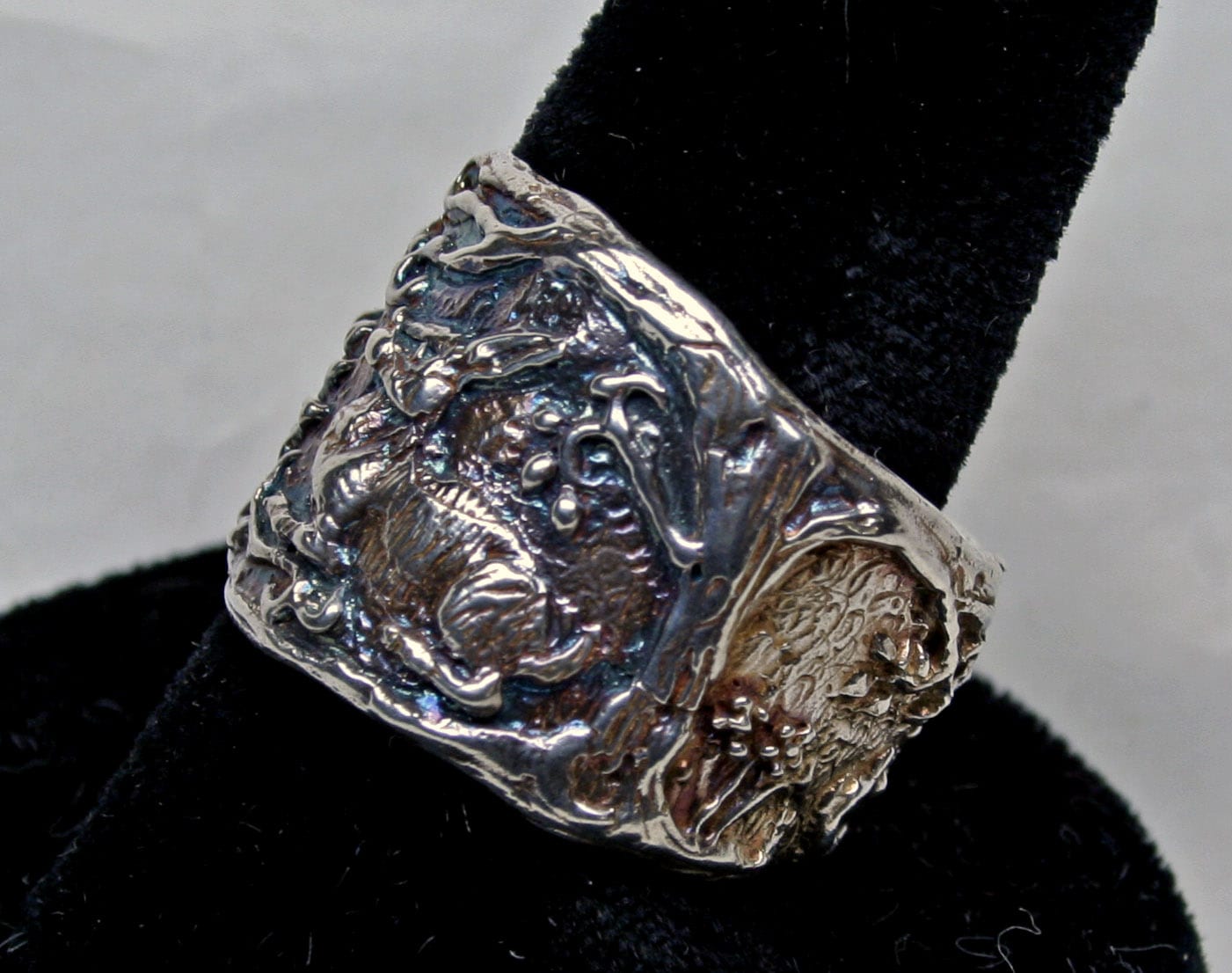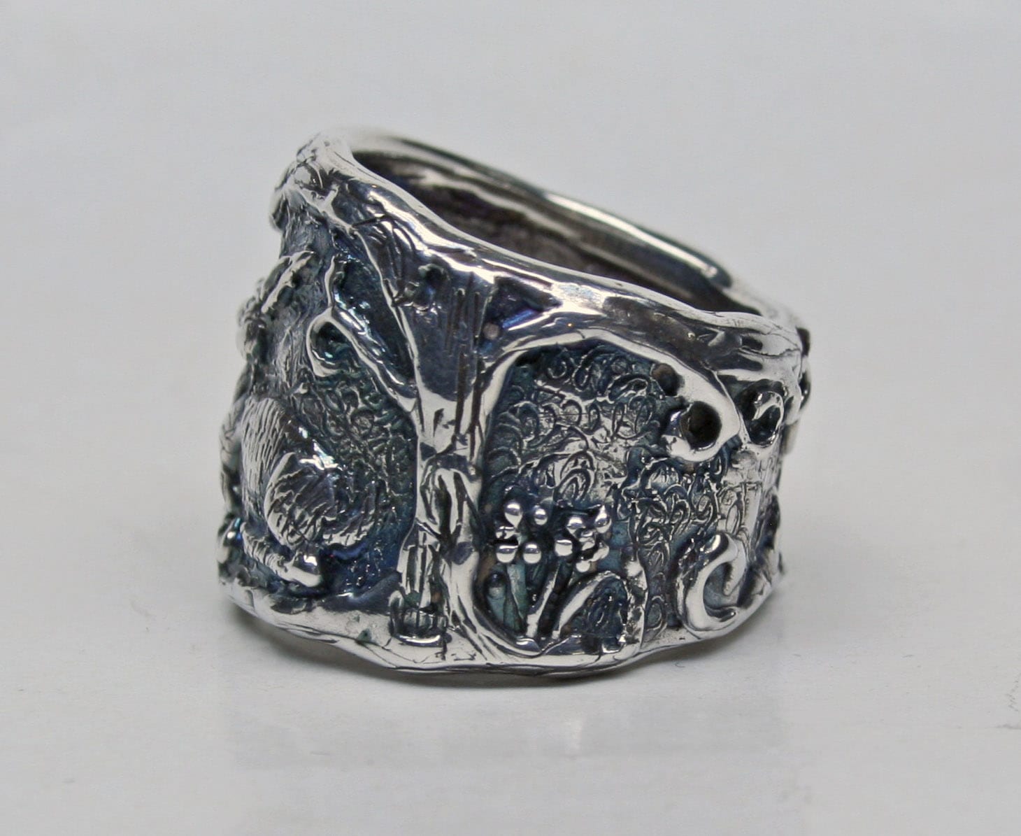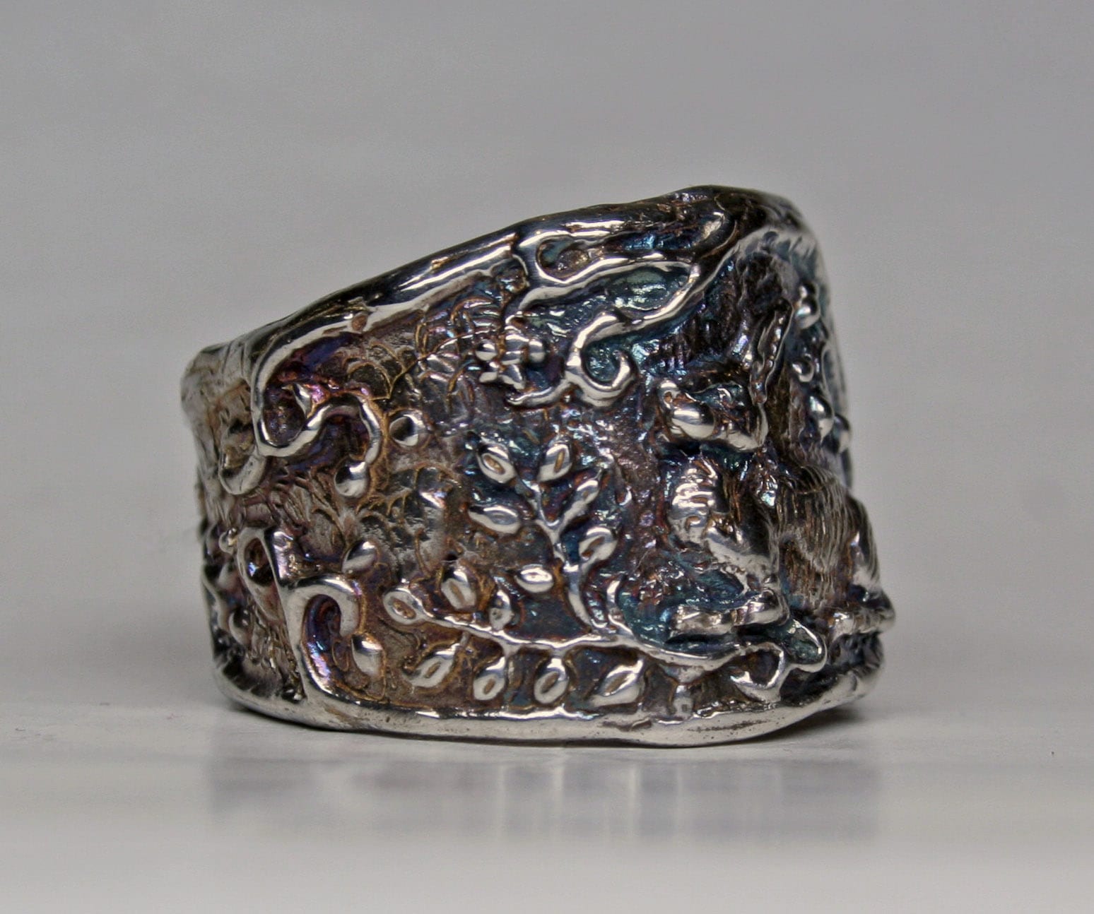 The ring shown is a size 7.5. This example is in a bright finish that will naturally oxidize in time. We have made many pieces with nature and animal themes. to see more click this link: https://postgatejewelers.com/product-category/animal-jewelry-flower-vine-pendant-emerald/