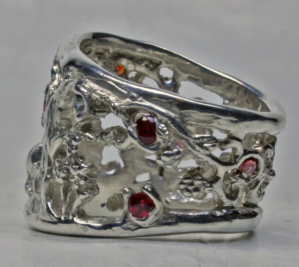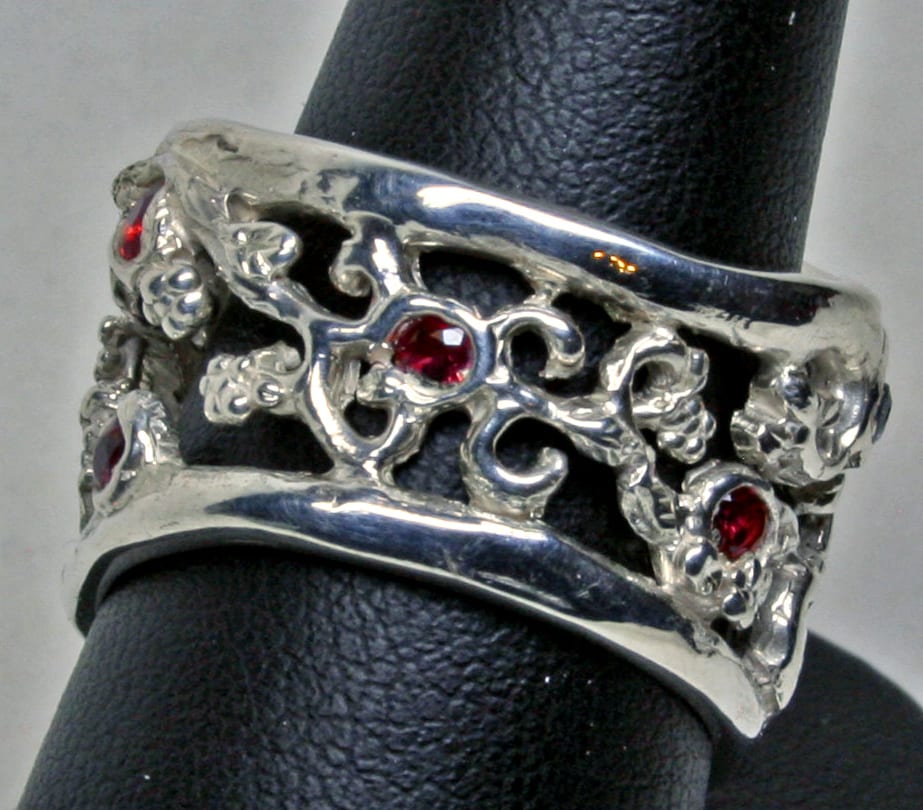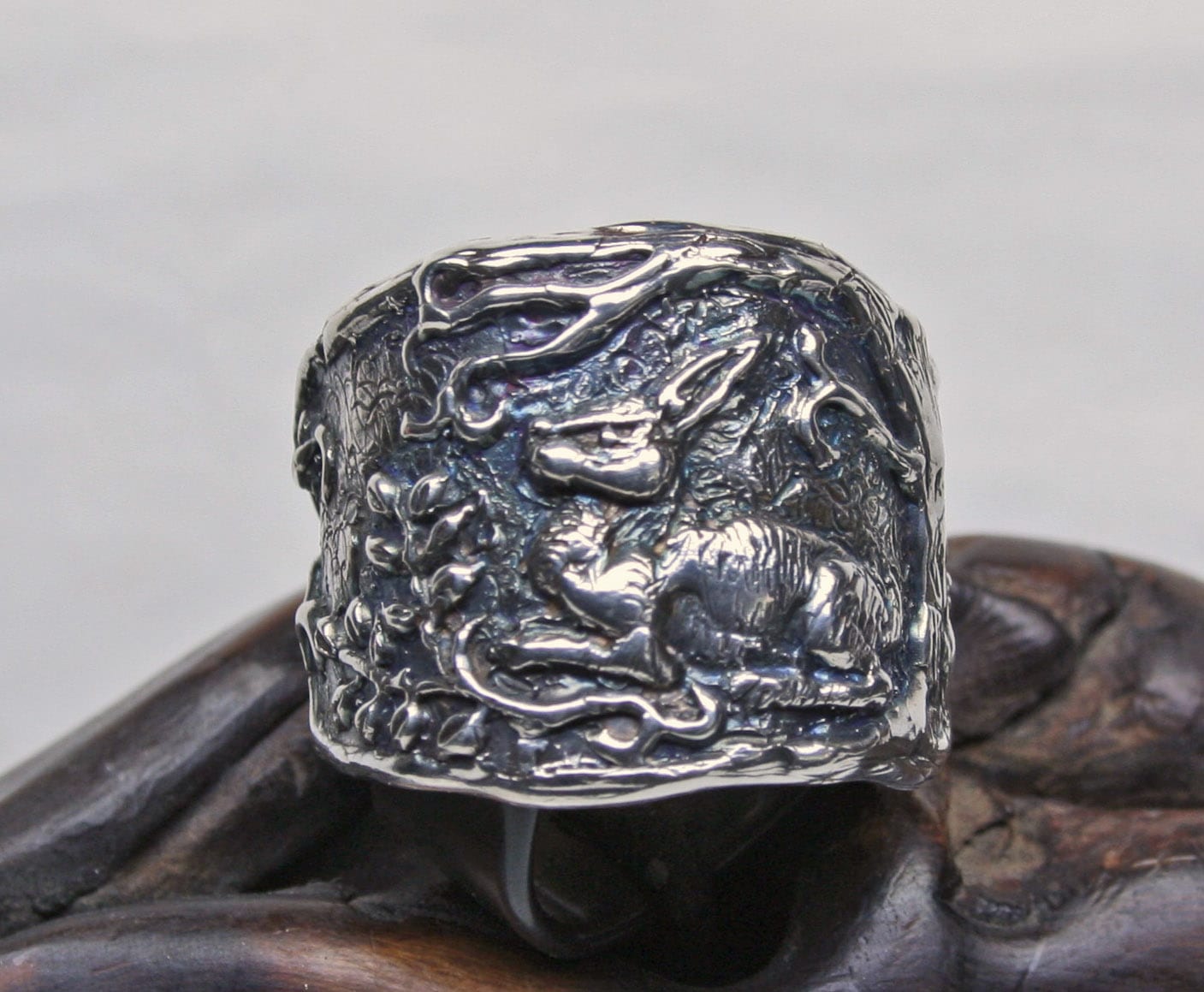 The ring shown is a size 7.5. This example is in a bright finish that will naturally oxidize in time. We have made many pieces with nature and animal themes. to see more click this link: https://postgatejewelers.com/product-category/animal-jewelry-flower-vine-pendant-emerald/