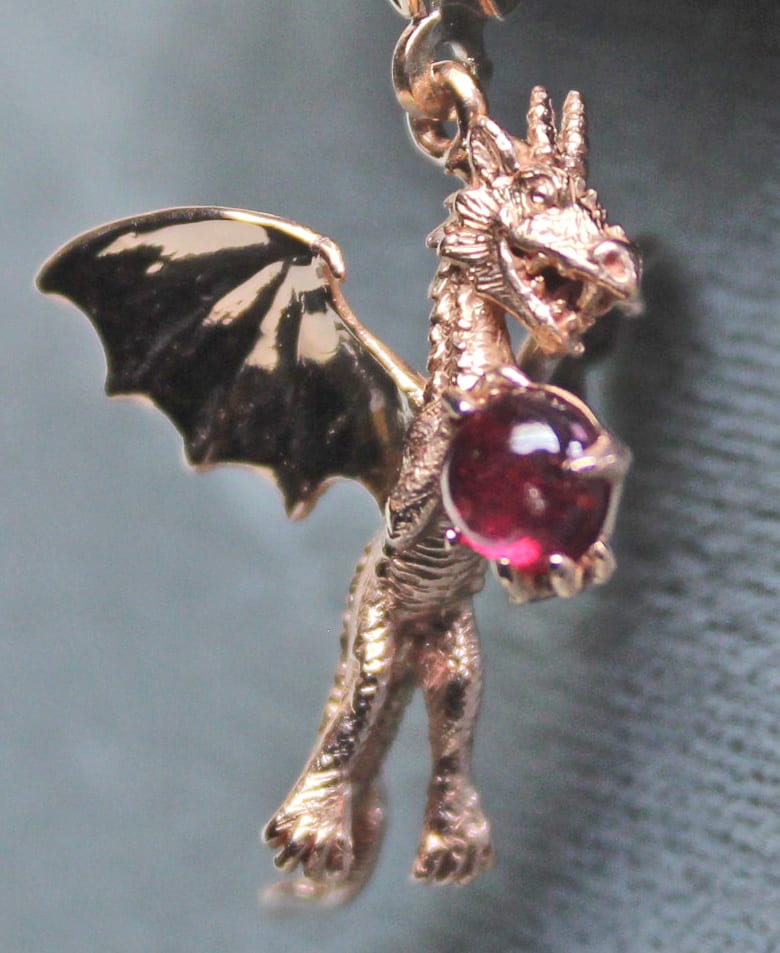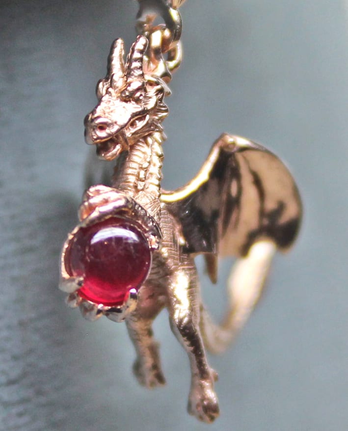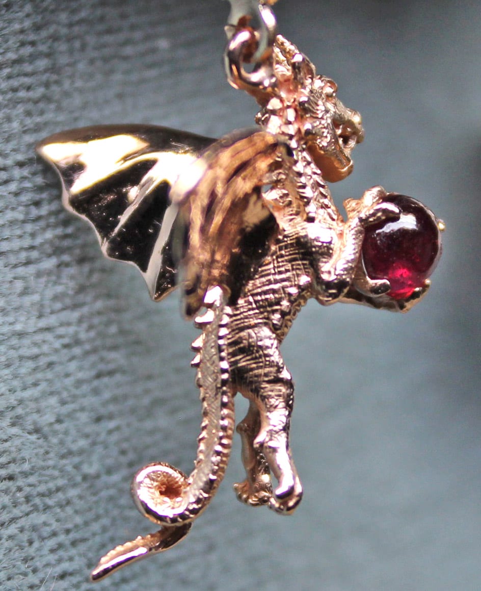 The red dragon earrings were designed and created in 14k red gold by George. Each dragon is clutching a very nice cabochon cut ruby. You may order a pair in your choice of gold and stones. The dragons are complete with scales, wings, and teeth; all nicely detailed. The dragons are similar to each other but not identical. They are also in different poses and symmetrically oriented. The dragons are approximately 22mm long and are original designs by George Postgate who also created them. They hang from 14k red gold lever-backs. The price shown is from 01/20020, the price will vary a bit due to fluctuations in material prices. Just get in touch and we will give you a set price and delivery date. Suzan and I have made several pendants with forest and animal pieces. To see more, please click on this link to take you to some of our pieces: https://postgatejewelers.com/product-category/animal-jewelry-flower-vine-pendant-emerald/ We have a page with pieces that tell stories that we have made for our customers also. These range from a ring showing a dragon and lady who lure hapless knights to their doom, to a bracelet that was based upon Jean Cocteau’s 1946 film Beauty and the Beast. Here is a link to that page, enjoy: https://postgatejewelers.com/story-pieces-jewelry-tales/ You can order any of these in the gold Karat and color with your choice of stones. Some pieces are only available in gold because of the time that has gone into their development. We have a wide selection of our work on FaceBook. Some pieces are shown in various stages of completion. When we do a special piece for a customer we often send them image of waxes. This makes it easier for them to understand what we are doing. It also allows us to work together and insure the creation of something special: https://www.facebook.com/Postgate-Fine-Jewelers-111540785537658/photos/?view_public_for=111540785537658&ref=page_internalRed dragon details: