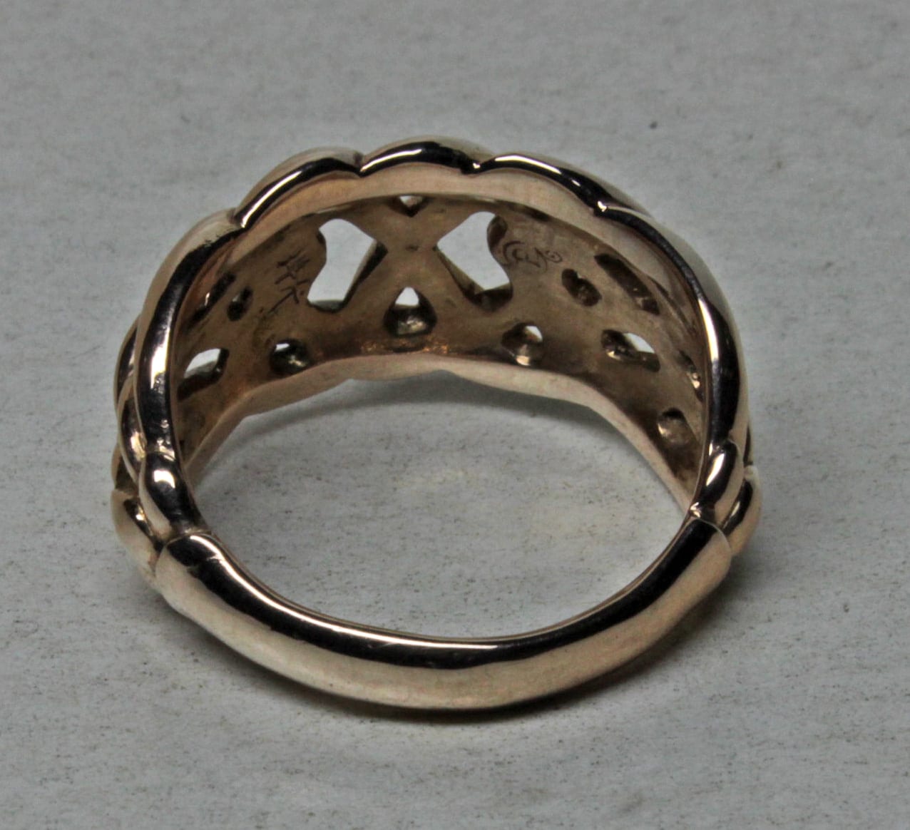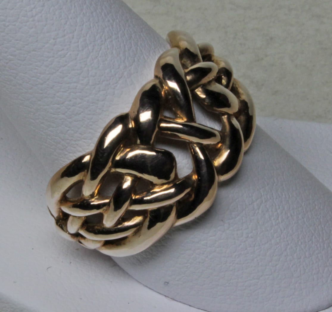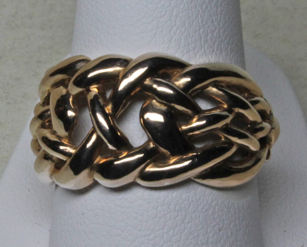 This band is made in 14K rose gold. Our refiner calls this alloy red gold because it has the strongest red color of their rose gold alloys. The band is 1/2″ wide at its top and is a size 9 1/2. The design was inspired by traditional Celtic knot-work designs. To see more of our Celtic jewelry click here: https://postgatejewelers.com/product-category/celtic-jewelry/