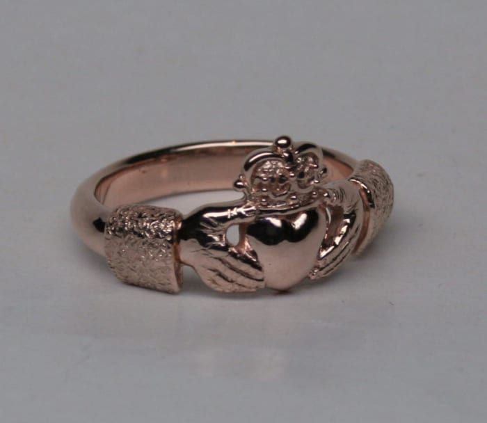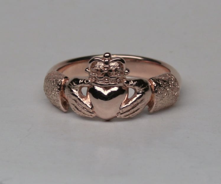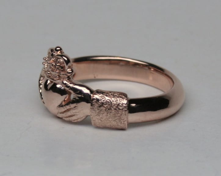 This version of the ring has a solid gold heart. We can set a stone into the heart or even replace it with a heart shaped stone. This ring is available in your choice of 14K to 22K gold in one or three colors. This ring is also much heavier than most, and is made to last a lifetime. The price will reflect any change in weight or karat of gold, of course.