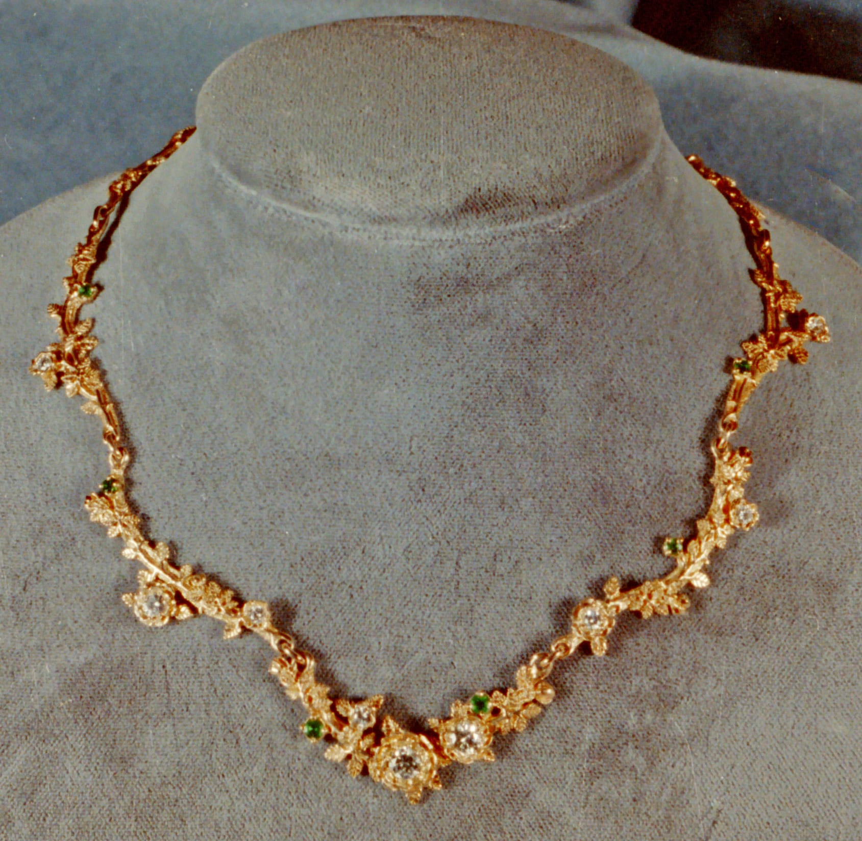 The Gold Rose necklace with diamonds and emeralds is destined to be one of your most treasured heirloom pieces. If you like our flower pieces, you will love this highly detailed necklace that becomes a garland of roses that you can wear. I have a picture in our workshop of our youngest daughter wearing the last one that I made. She has a mischievous smile on her face, so I added the caption, " At this moment Tami realizes that she can out run her father." Yes, it's that pretty. The price listed here is just for the necklace without stones. You can choose any available stones that you want and their value will be added to the final cost of the necklace.