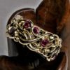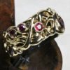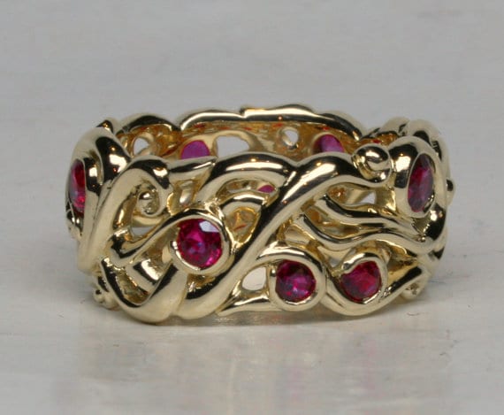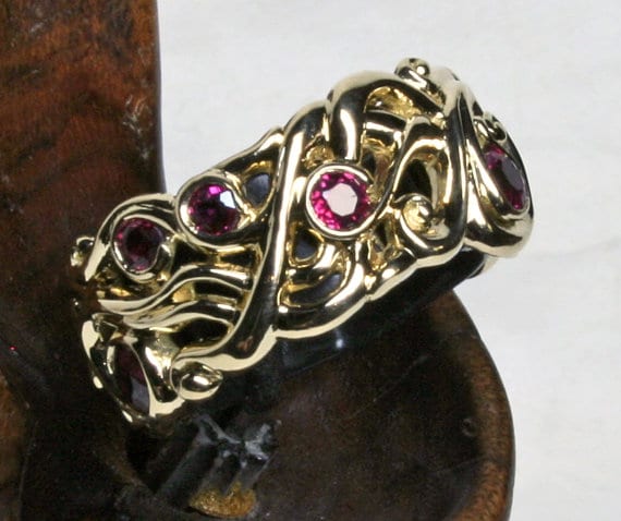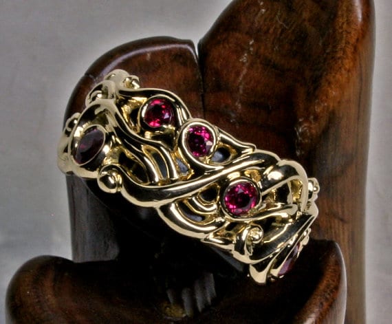 This is an original design by George who hand carved it in wax, and then re-carved it after it was cast, in gold. The design represents the nexus of Art Nouveau and Art Deco. I’ve set 1.34cts total weight of very fine natural rubies in this ring. Some of the rubies have a few flaws but nothing that detracts from their beauty. The stones are natural and untreated. The color of the rubies is my personal favorite. The color is deep without being too dark. The band is approximately 11mm wide. We have a selection of our other wedding bands here: https://postgatejewelers.com/shop/bands-wedding-rings/