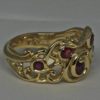 Ruby swirl ring, It's design was inspired by the fables surrounding the Arthurian legends. Swirls of gold make up the ring. Rubies burn within the golden swirls invoking the magic that I feel must have been present in the mists surrounding the fabled island. check out some of oue other bands and rings here: https://postgatejewelers.com/shop/bands-wedding-rings/