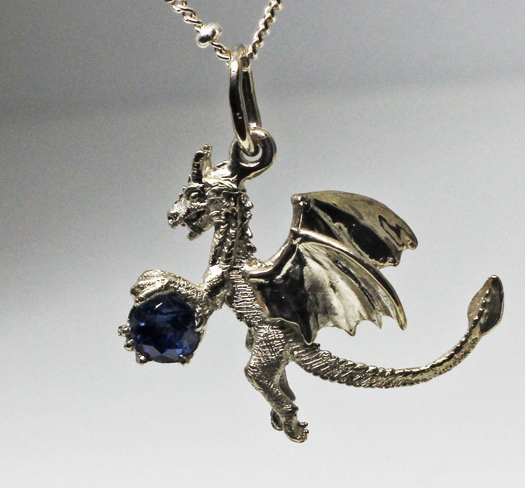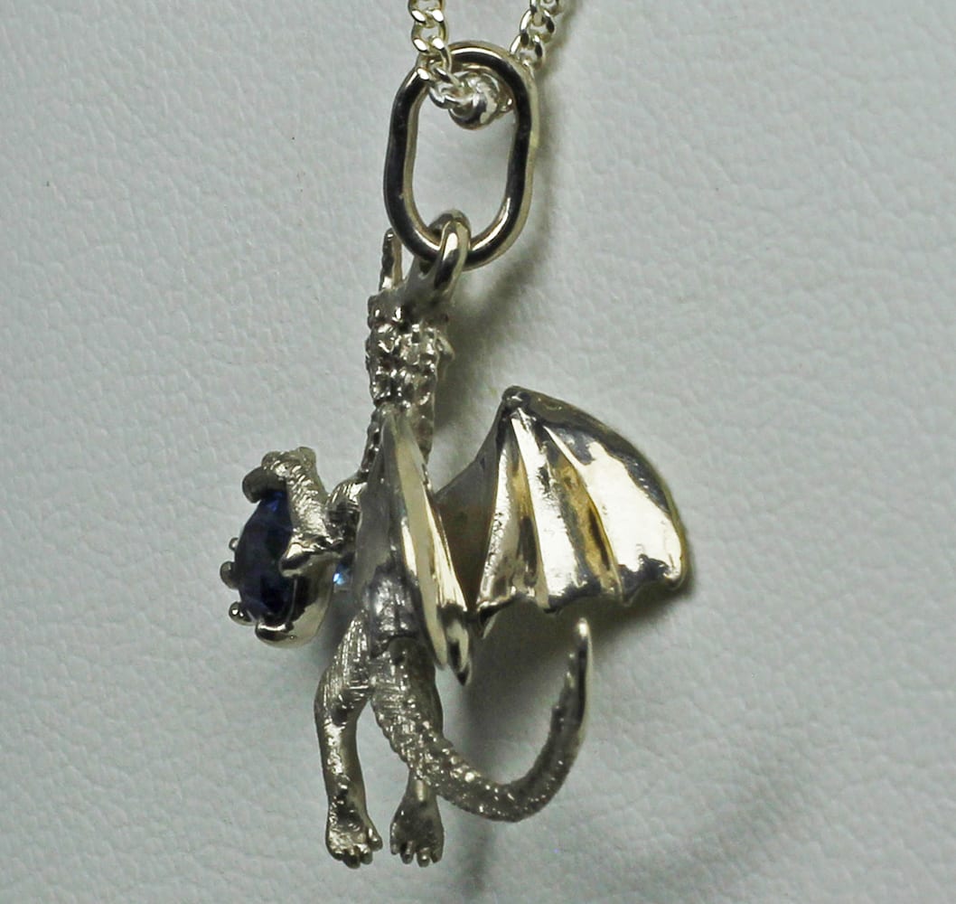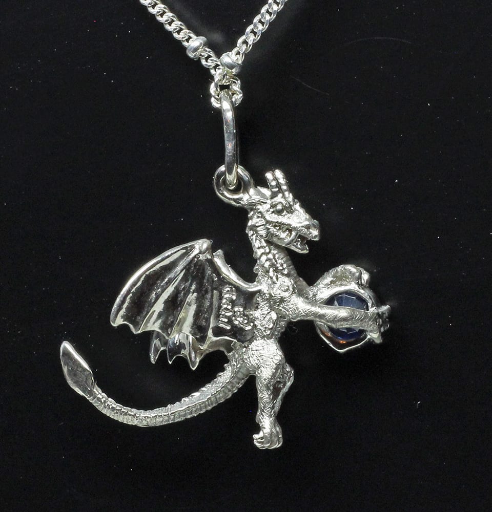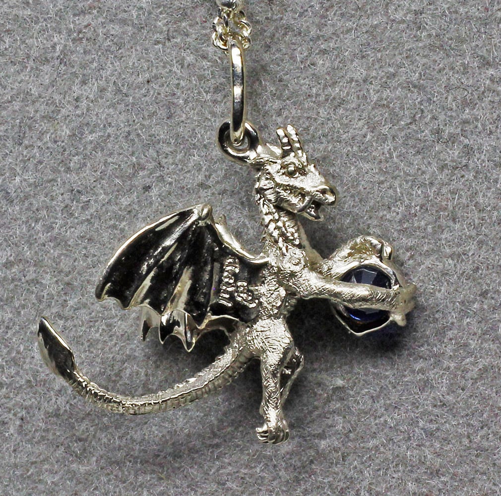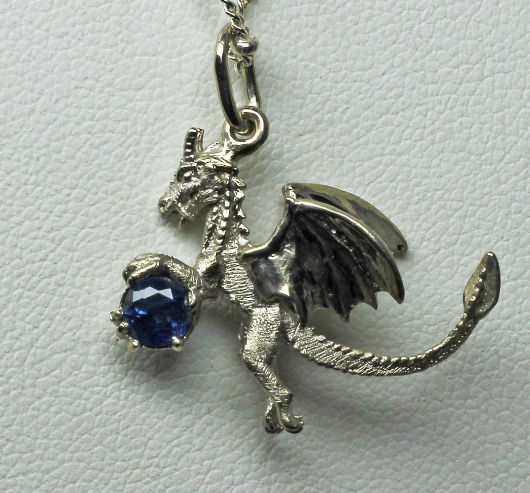 Sapphire dragon pendant in 14PD white gold, an original, by George Postgate. was designed and made by George Postgate. is a small dragon sculpted out of 14PD white gold. It is approximately 1” X 5/8" in size. A Beautiful natural blue sapphire, about 5 mm in diameter is clutched in the dragon’s claws. If you are unfamiliar with white gold marked PD, please follow this link: https://postgatejewelers.com/materials-we-use-to-make-our-jewelry/