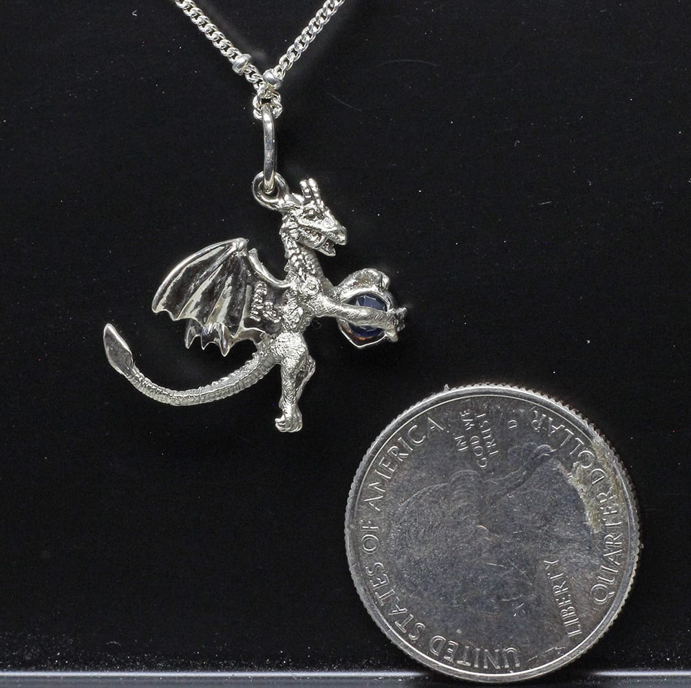 The sapphire is a natural, medium blue brilliant cut stone that has several flaws. In spite of the flaws the stone looks great and its color is quite pleasing. No chain is included but we can include a very high quality chain in most link styles in 14 K gold at a good price. Just contact us and let us know what you want to hang your feisty dragon from? Please note that these are 06/07/2020 prices. Gold prices can fluctuate so custom orders and chain prices can vary. We will give you the correct price when you order or inquire. To see a few of our favorites click here: https://postgatejewelers.com/14k-gold-chain-link-styles/ Most of these with the exception of the baroque chain should be available in white 14K gold.