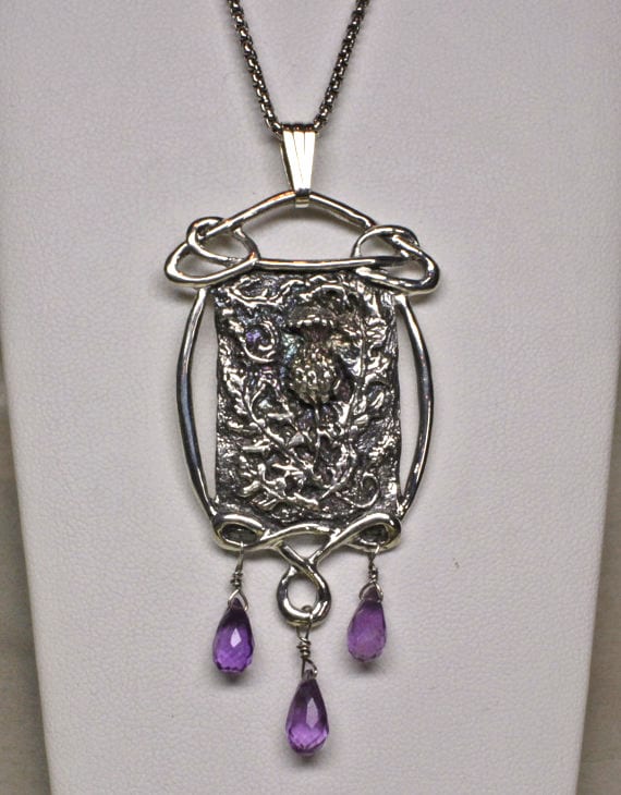 Scottish Art Thistle Pendant in sterling silver with three amethyst briolettes