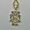 The pendant is made of 14K yellow gold and it has a fine quality oval faceted natural lemon colored citrine as it’s center stone. The crown of the pendant is set with three diamonds, two 1.5mm brilliant cut diamonds and one 2.5mm diamond all are approximately Vs2 G-H in quality. The pendant is approximately 25mm high X 15mm wide. A chain is not included but we can supply you with just about any style you might want if you need one.