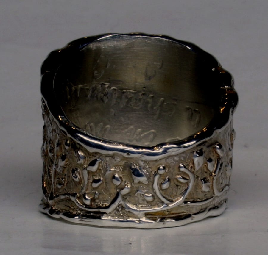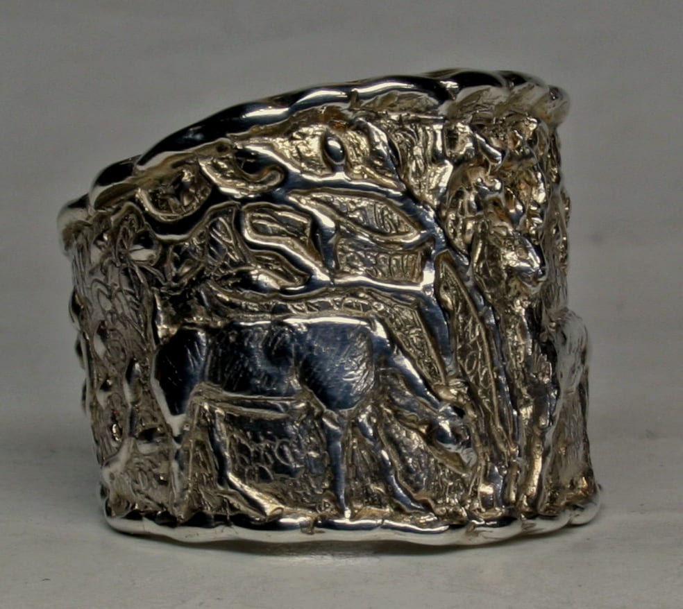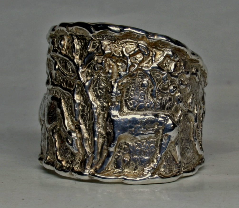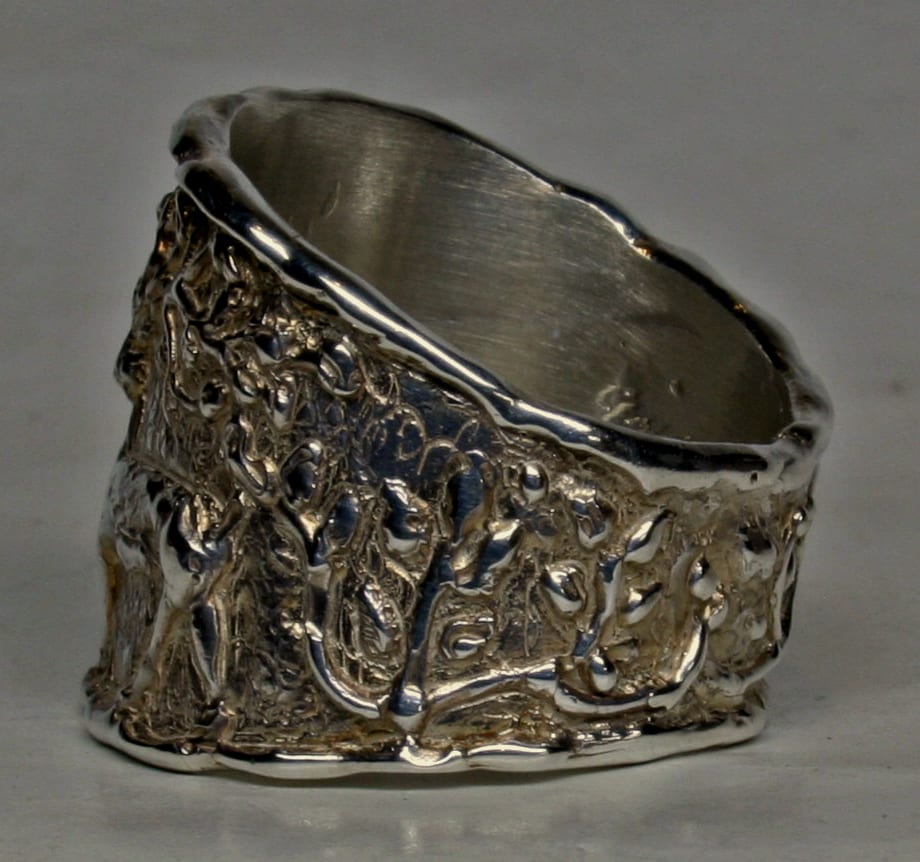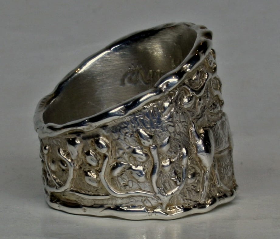 This ring may be ordered in bright or oxidized Sterling silver or in gold. The bright version will darken over time. Wiping the ring with a soft cloth will keep raised details bright while recessed details will darken. The ring can even have stones set into it as a special order. Check out our special orders page for more about special ordering and a chance to see some that we have made for our customers: https://postgatejewelers.com/special-order-jewelry/