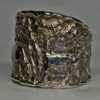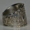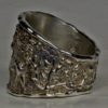 This ring may be ordered in bright or oxidized Sterling silver or in gold. The bright version will darken over time. Wiping the ring with a soft cloth will keep raised details bright while recessed details will darken. The ring can even have stones set into it as a special order. Check out our special orders page for more about special ordering and a chance to see some that we have made for our customers:Â https://postgatejewelers.com/special-order-jewelry/