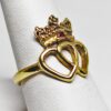 This ring was designed and hand made by Suzan. The ring is about 3/4″from the top of its crown to the bottom of the hearts. it is set with a small emerald cut ruby, it can be ordered with most stones in most ring sizes. It is designed to be comfortable and easy to wear. It slides easily into and out of pockets without snagging. Check out our facebook page if you are interested in our designs and how we make our jewelry: https://www.facebook.com/Postgate-Fine-Jewelers-111540785537658/photos/?view_public_for=111540785537658&ref=page_internal