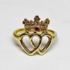 This ring was designed and hand made by Suzan. The ring is about 3/4″from the top of its crown to the bottom of the hearts. it is set with a small emerald cut ruby, it can be ordered with most stones in most ring sizes. It is designed to be comfortable and easy to wear. It slides easily into and out of pockets without snagging. Check out our facebook page if you are interested in our designs and how we make our jewelry: https://www.facebook.com/Postgate-Fine-Jewelers-111540785537658/photos/?view_public_for=111540785537658&ref=page_internal