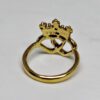 This ring was designed and hand made by Suzan. The ring is about 3/4″from the top of its crown to the bottom of the hearts. it is set with a small emerald cut ruby, it can be ordered with most stones in most ring sizes. It is designed to be comfortable and easy to wear. It slides easily into and out of pockets without snagging. Check out our facebook page if you are interested in our designs and how we make our jewelry: https://www.facebook.com/Postgate-Fine-Jewelers-111540785537658/photos/?view_public_for=111540785537658&ref=page_internal