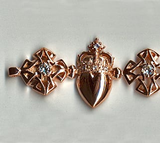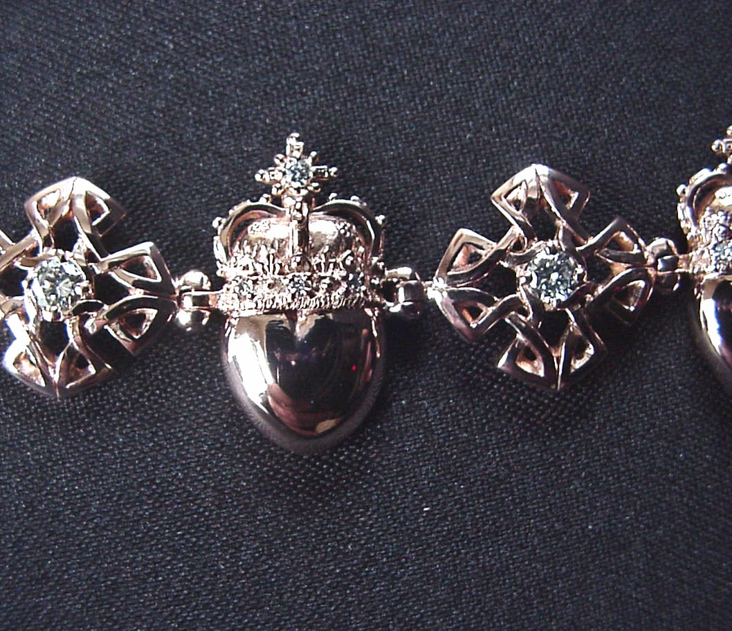 The Scottish Luckenbooth bracelet Celtic knots and diamonds in 14k rose gold by George Postgate. Like all of our jewelry this bracelet is hand made it looks wonderful and is comfortable. The origin of our design is the traditional Scottish Luckenbooth. This is a beautiful and elegant bracelet that will give its owner many years of pleasure as well as a way to celebrate their Scottish heritage. Check out more of our Scottish designs here: https://postgatejewelers.com/scottish-jewelry/