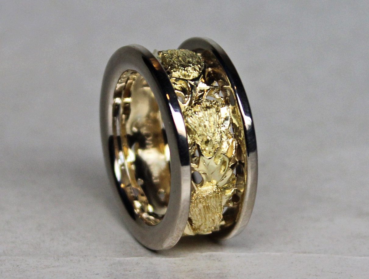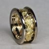 The ring is about 1/2″ wide. You can order it in different sizes, gold karats, and colors by special order. Other modifications are also possible. This one has borders that are just high enough to protect the detail within. You can order the band with lower borders as well. The sides and of the ring are made of white 14K palladium gold. This is a superior alloy that is consistent in color and is also safe for persons with metal allergies.