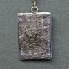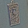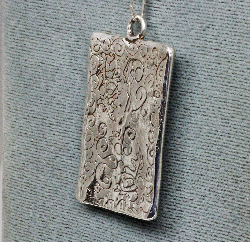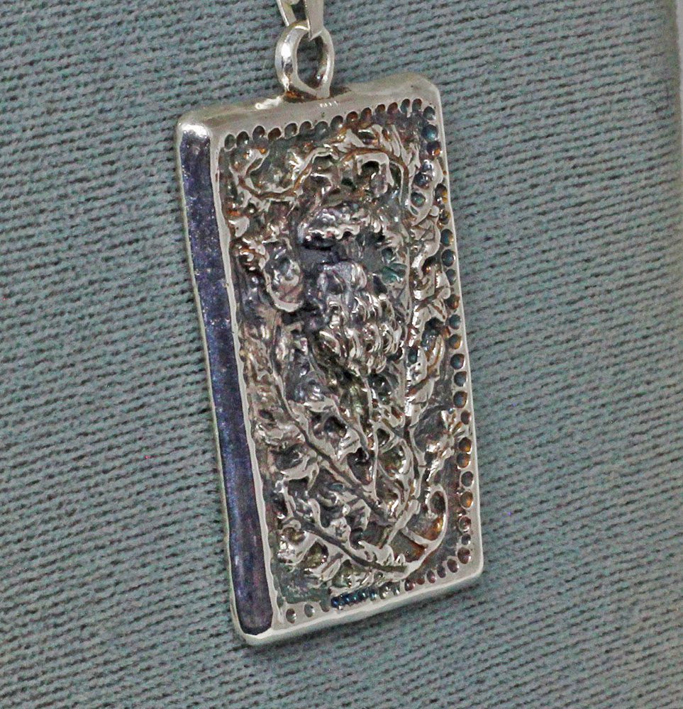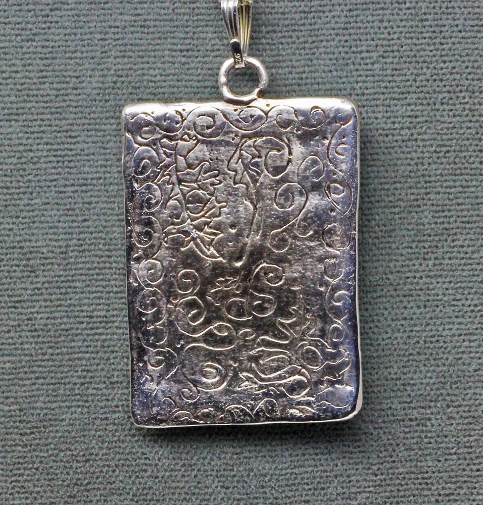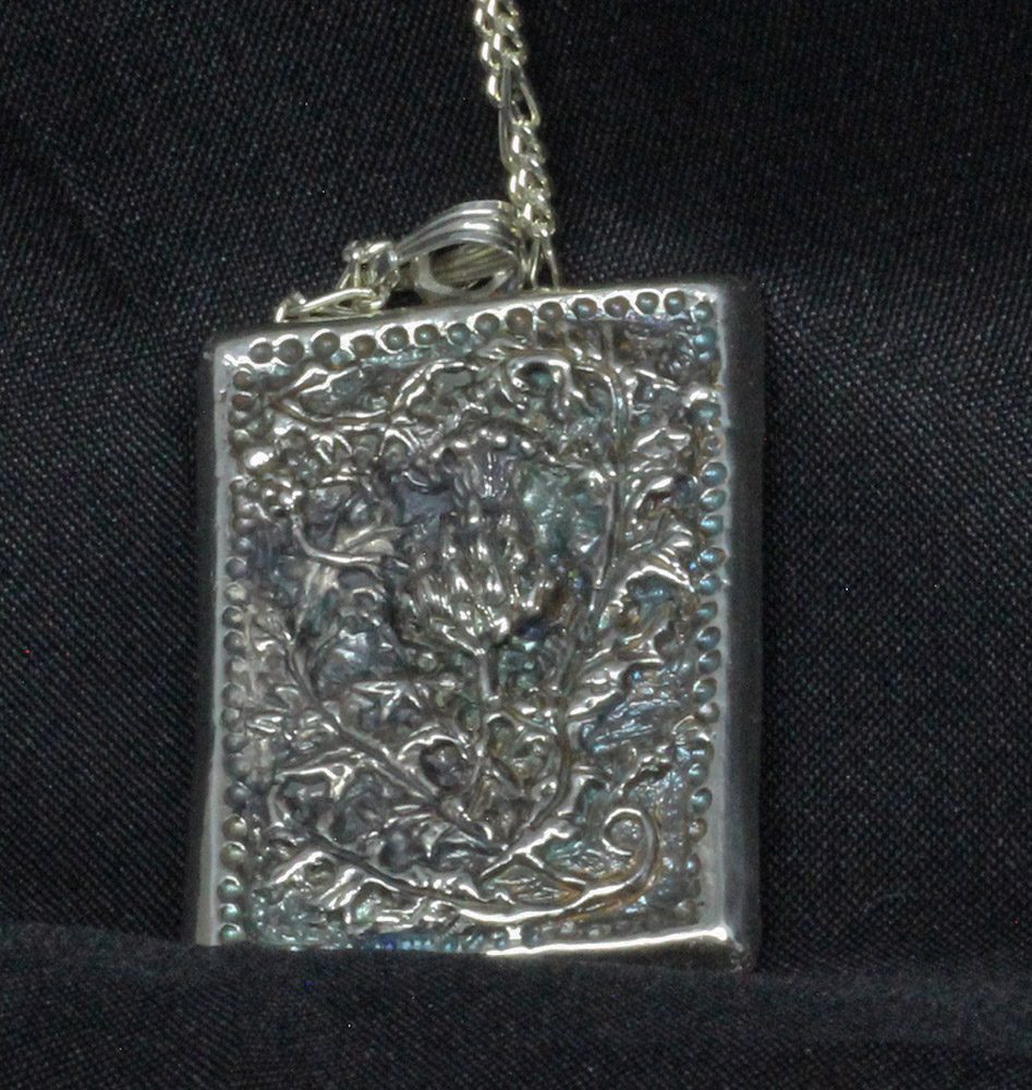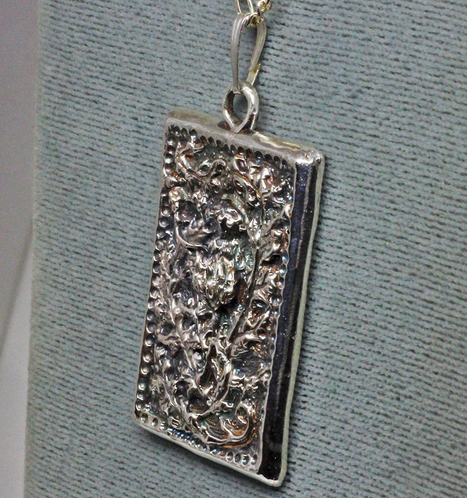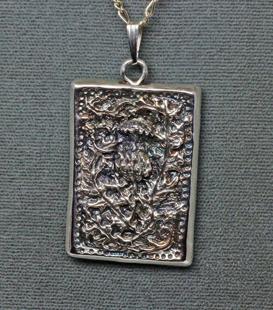 The pendant can be ordered in a bright finish which will slowly oxidize in time. You can control this process by wiping the pendant with a soft cloth occasionally. This will keep raised details bright while allowing recessed areas to darken. You can also order the pendant in gold. We work in 14K and 18K white, yellow. and rose gold. We prefer the color of 14K rose gold and don;t often work in 18K rose gold. Suzan can also set stones into the pendant.