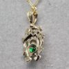 The pendant is made of 14K yellow gold and it has a very fine quality 5mm brilliant cut natural tsavorite as it’s center stone. The crown of the pendant is set with two 1.5mm and one 2mm brilliant cut diamonds, approximately Vs2 G-H in quality. The pendant is approximately 25mm high X 15mm wide. A chain is not included but we can supply you with just about any style you might want if you need one.