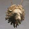 I made a wax wire open structure that formed the head’s interior. I then held my wire waxing tool on its side and filled in the caps between wires with a sheet of hot liquid wax. Once the wax cooled I added more wax and details. The pendant is approximately 2.5″ tall and weighs about 2.5 oz. It is entirely hand sculpted. The chain is not included. We can give you a choice of high quality chains in just about any link style, or length at a good price. A sterling silver version of our lion’s head pendant will weigh less than 2/oz. We can finish the head in a bright finish or in an oxidized one.