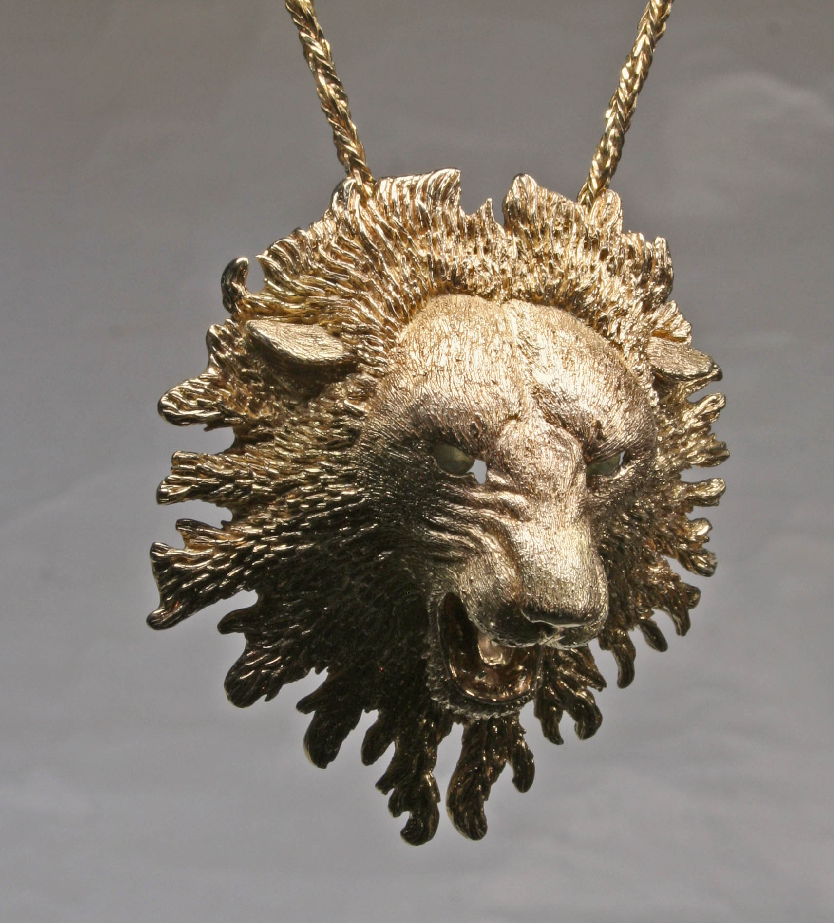 The Large Lion’s head Pendant in 14 K is a fine example of the work that I was doing in the 70s and 80’s. It remains one of my favorite pieces, made in 1978. I studied lion heads for quite a while before I made it. I wanted him to be noble beautiful and a little bit scary, he is a lion after all. My lion’s head not only has teeth but you can see the taste little barbs on his tongue.