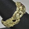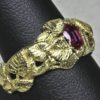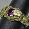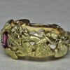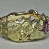 The band is a flowing design of Silver Birch leaves that meet in its center to surround a fine colored natural faceted pink sapphire. The sapphire is a bright, beautiful, pink. The stone does have some flaws but to my eyes they just add to its beauty and uniqueness.