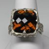 This ring is entirely hand made it was built up and carved in wax and cast in Sterling silver. The ring is set with a dark natural citrine. The stone is cut as a square rectangular 14 X 14 mm shaped stone with a checkerboard top. Bright flashes of orange move through its many facets as the ring is moved. Small orange moonstone cabs are set into the sides of the ring. If you would like to learn more about how we make our jewelry Please follow this link: https://postgatejewelers.com/waxes/