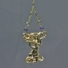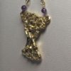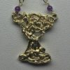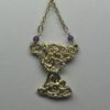 Spring maiden pendant amethysts and ruby in 14K an original design by Suzan Postgate. This pendant shows a tree in the forest changing into a maiden. The maiden is shown happily picking and admiring some newly opened spring flowers. The pendant hangs lavalier style, from a triangle of figaro links and three amethyst beads that connect it to a flower of gold with a ruby in its center. A Celtic knot bale at the top of the flower link connects the pendant to its chain. Check out some similar designs here: https://postgatejewelers.com/product-category/flowers-vines-and-animal-jewelry/
