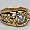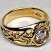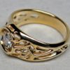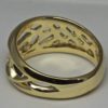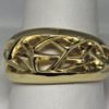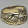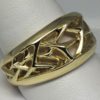 Starburst wedding band designed and hand made by George Postgate. The band is 12 mm wide at its widest. The upper three quarters of the band is carved in 14 K yellow gold into an openwork starburst pattern of interlocking rays or crystals. Polished surfaces reflect and fill the design with light.