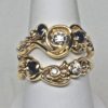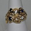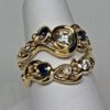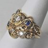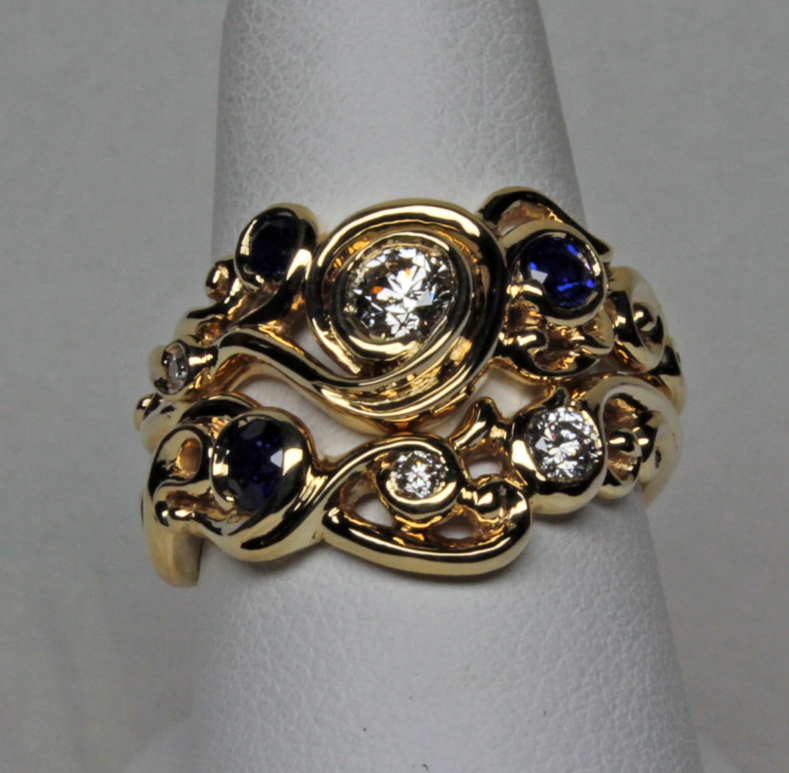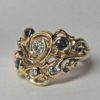 This wedding set is completely hand made. It was first carved in wax and then in the metal by hand. A total of four diamonds and three sapphires are set in the two rings. The diamonds are fine brilliant cut natural stones with a total weight of 0.41 cts. The largest diamond is 0.25 cts in weight. They are all approximately G-H in color and Vs2 in clarity. The three sapphires are also brilliant cut natural stones. Their color is a fine blue. They do have some small flaws but nothing that detracts from their beauty.