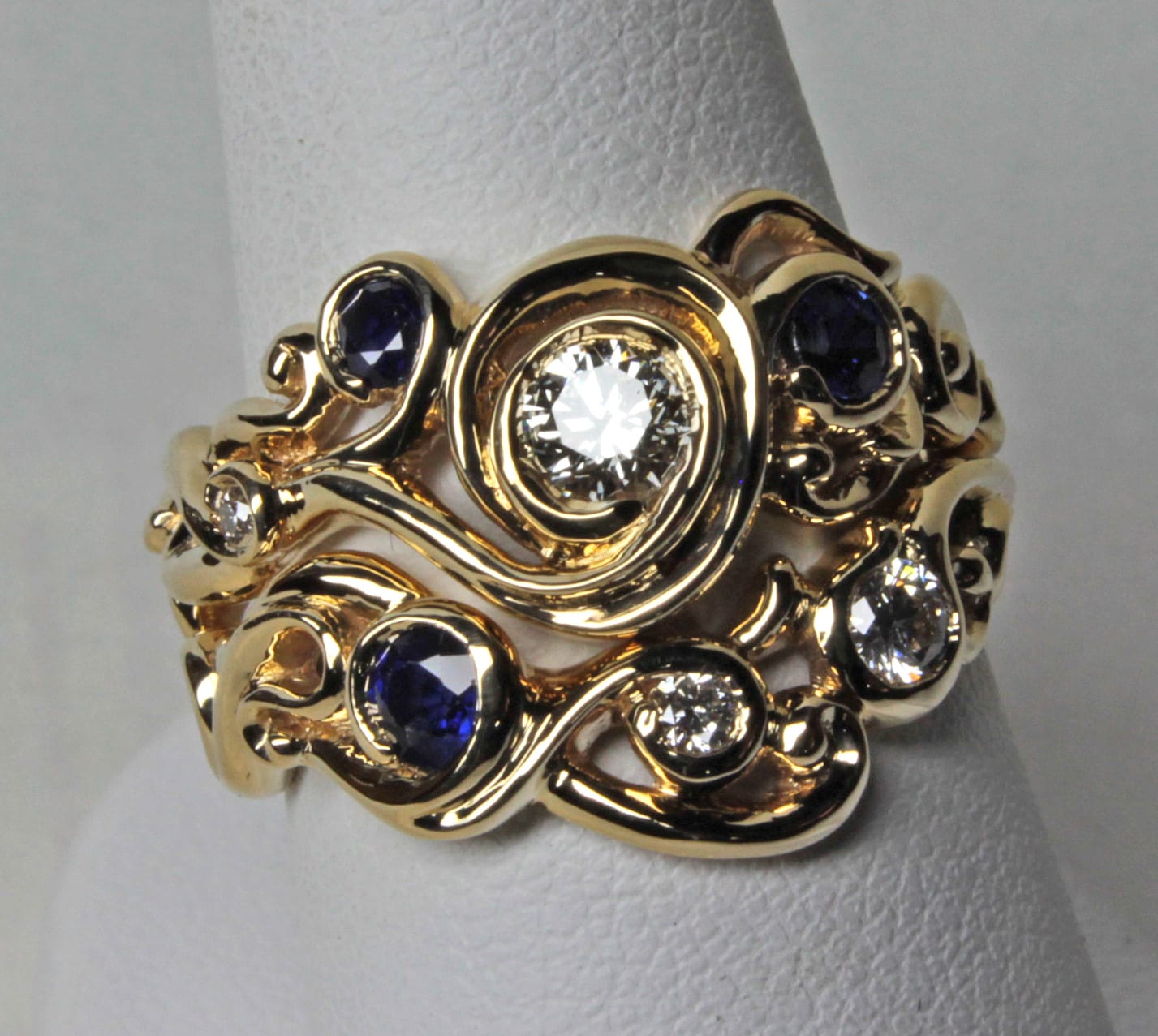 You may order the swirl wedding set in almost any size. It is available in 14, 18, 22 K and in rose, white and yellow gold. We will set just about any stones that you might want into the setting. We have a page that explains more about custom orders. It also has a selection of some of our favorite custom pieces: https://postgatejewelers.com/special-order-jewelry/