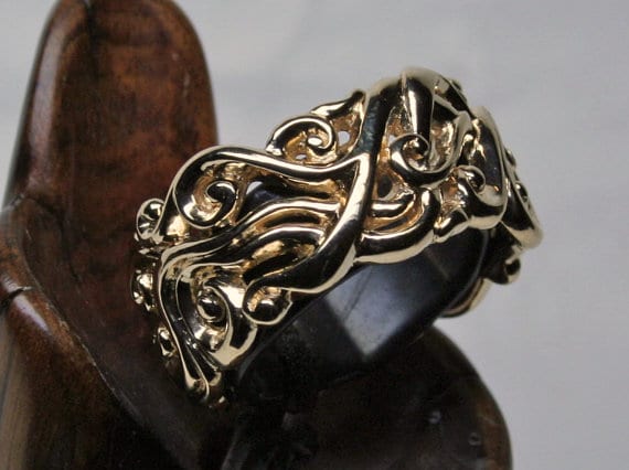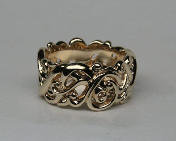 All of the ring’s surfaces are nicely rounded smooth for comfort. The ring is 3/8ths of an inch wide. The ring may be ordered in other widths, karats, and colors of gold by special order. The ring is heavy enough for daily wear and because of its design it will stay on without having to be tight and it allows the skin to breathe. Our son in law has a version of this ring he’s had for about ten years. He never takes it off even though he should and the ring still gets compliments. Yours will last a life time if you take a bit better care of yours.