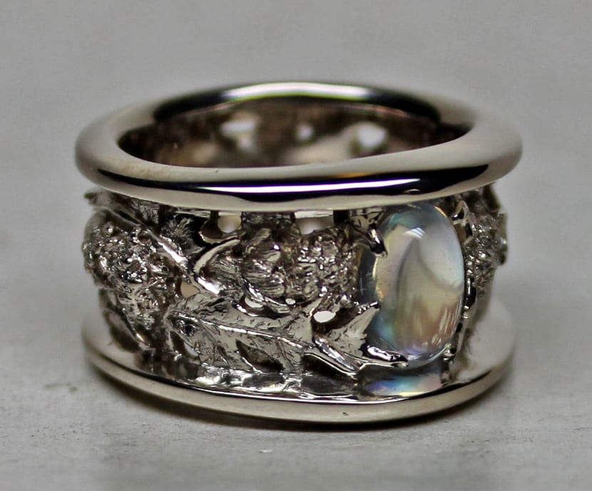 Our thistle band with rainbow moonstone consists of a highly detailed thistle design. The ring’s details and the moonstone are protected by raised smooth borders. The ring was hand carved in wax and then cast in gold. To learn more about the lost wax process that we use click our waxes link. You will find information on our process and also see several examples of waxes and the same pieces finished: https://postgatejewelers.com/waxes/