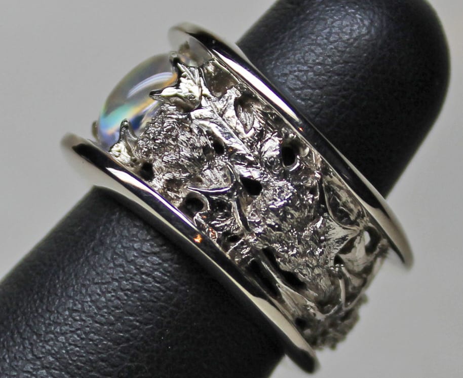 Thistle band with rainbow moonstone in 14K palladium white gold, by George Postgate