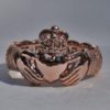 This ring shows a solid gold heart. We can set a stone into the heart or even use a heart shaped stone for the heart. We can make this ring in your choice of 14K to 22K gold in one or three colors. The ring can also be made with a solid band instead of the open knot-work band shown here. I can size this ring down, but if you need a larger size I’ll just make you a new one in white, yellow or rose 14, 18, or 22 karat gold. with or with out a stone. The price will reflect any change in weight or karat of gold, of course.