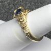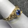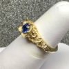 The Tudor style sapphire ring, is made in 14K and is set with a nice 4mm medium blue natural sapphire. The ring is a size 5 its details include raised swirls under the raised Tudor rose sapphire’s setting. This ring was designed and hand made by Suzan.