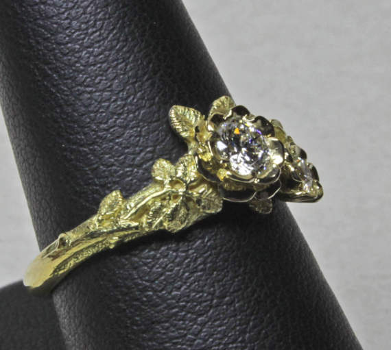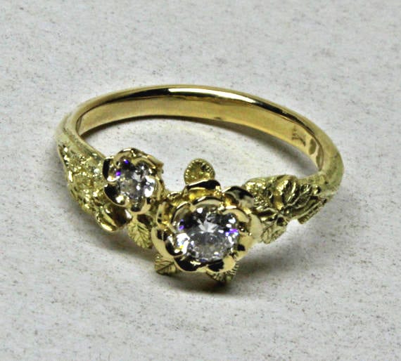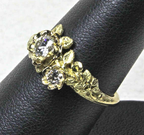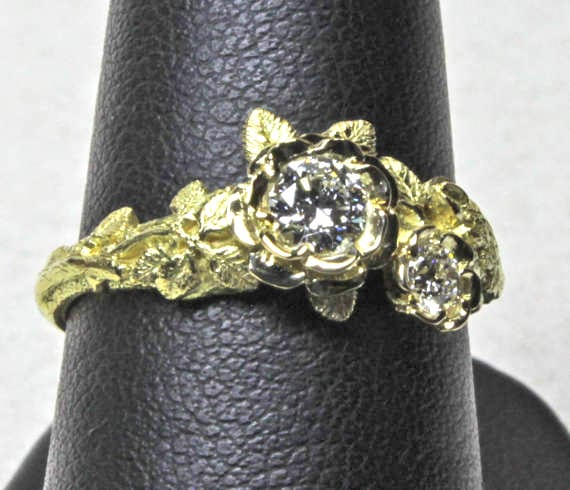 Two diamond rose ring, one of a series of flower rings that I first designed in the early 1970’s. I love this sort of jewelry and its challenges. Making jewelry that looks like living plants into a wearable piece of art is very enjoyable. This ring makes a great wedding ring as well.