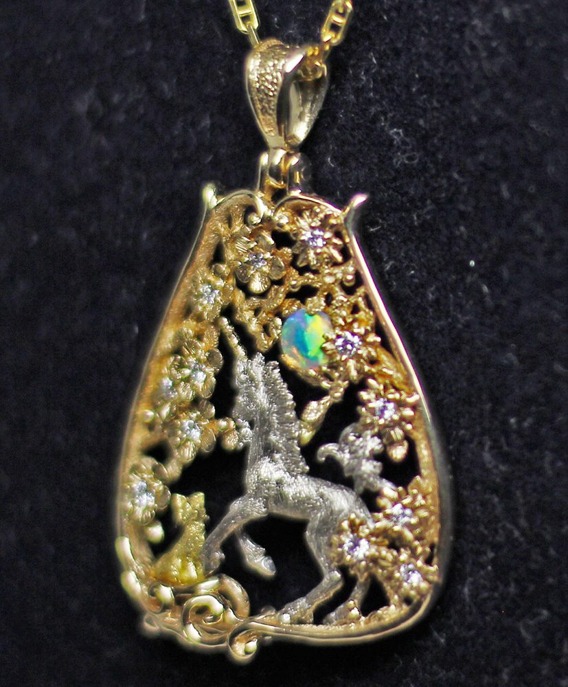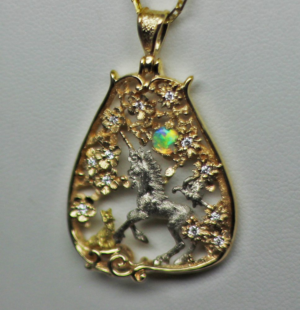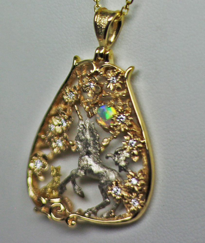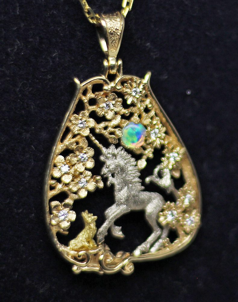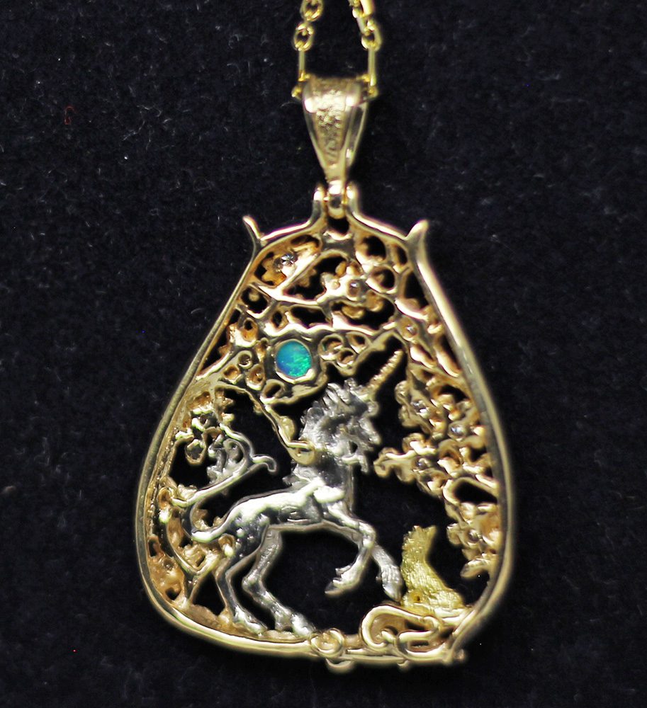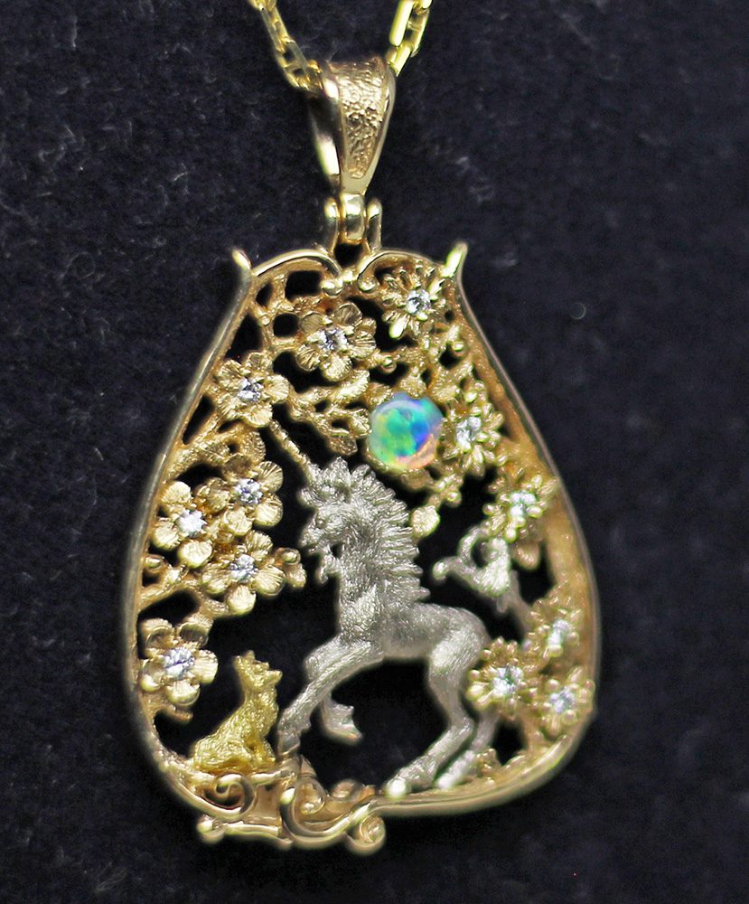 A Unicorn and a fox are shown in our pendant. They seem to be exchanging stories about their adventures. The Unicorn seems pretty excited as he tells his tale. This is a good example of the story jewelry that we make. If you like whimsical jewelry that tells a story, click here to see some of our favorites: https://postgatejewelers.com/story-pieces-jewelry-tales/