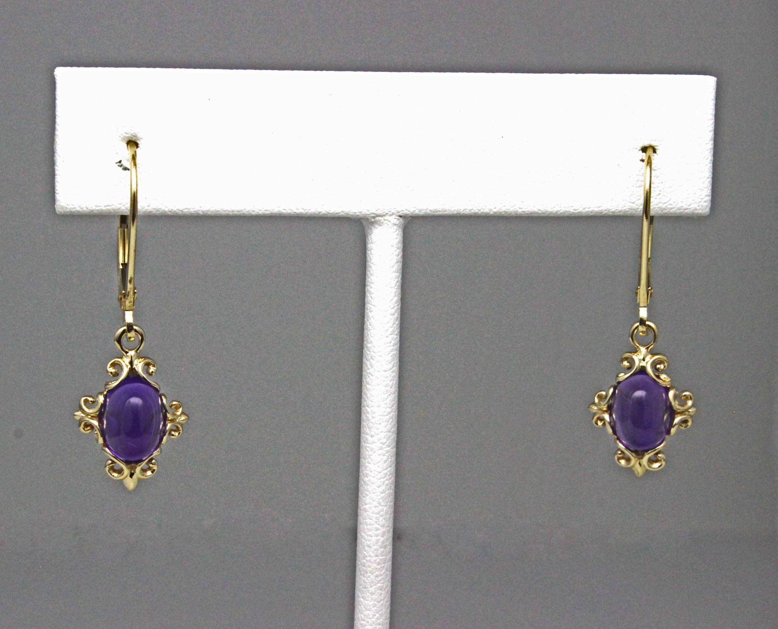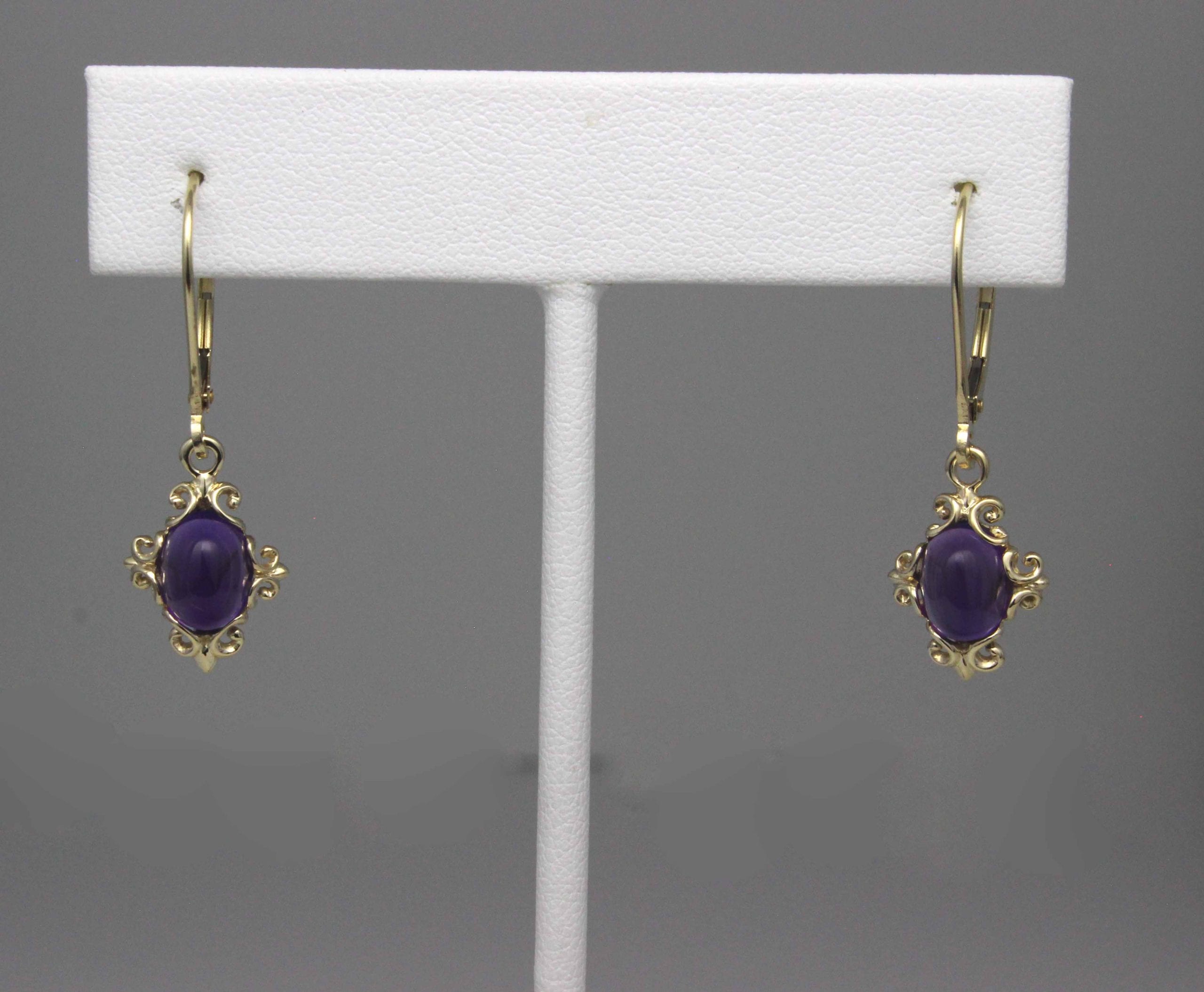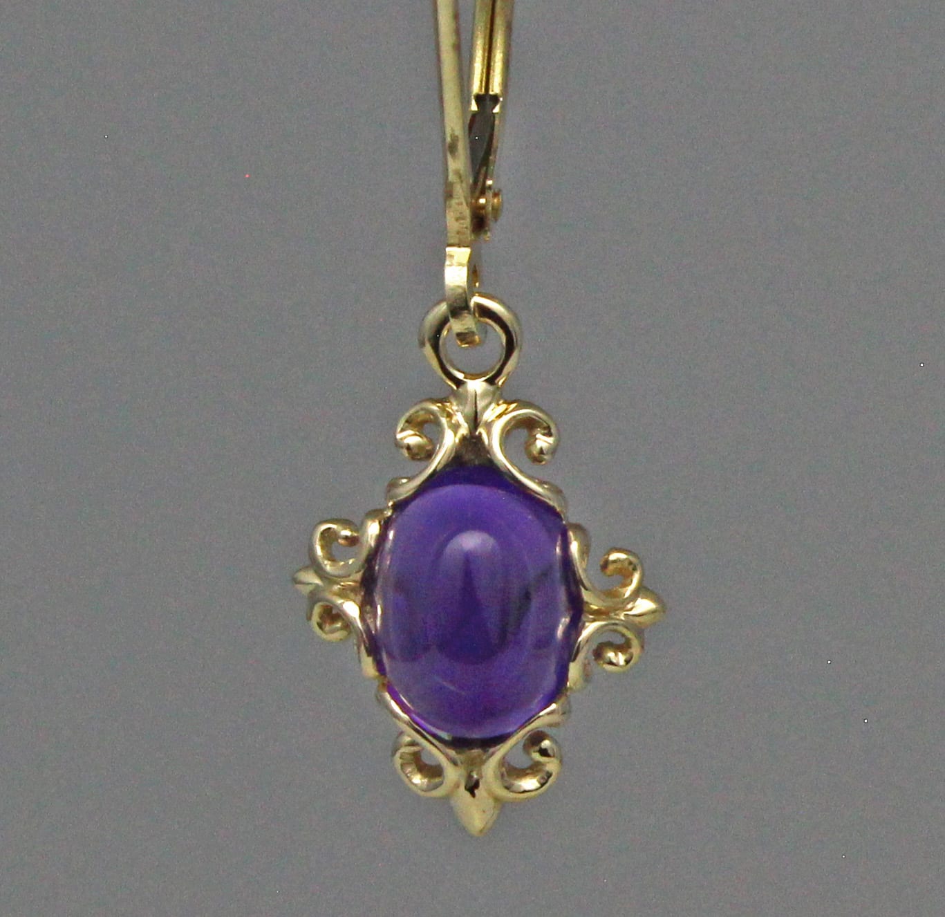 Victorian dark amethyst earrings in 14K. I've created these earrings in the Victorian style and set them with two deep amethyst natural cabochon stones.