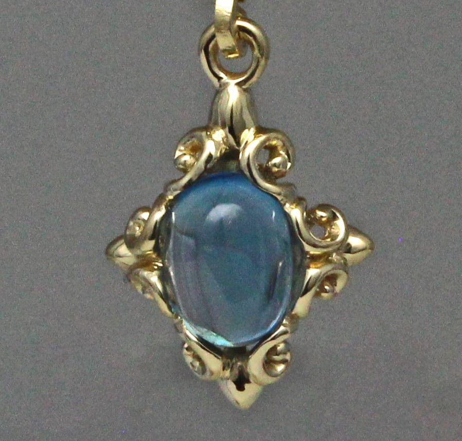 Victorian blue topaz earrings in 14K with leverbacks, These Victorian earrings are set with two London blue topaz cabochon stones. Although the stones look different in some photos, they are a perfect color match. The difference that you see is because one of the stones is slightly back lit. This gives you a chance to see how they look in different light, and how the earrings will look when you wear them. Check out more earring designs here: https://postgatejewelers.com/product-category/our-earring-designs/